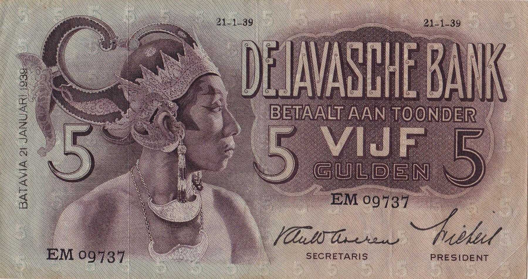 5 Gulden 1939 Java-danser. Pick 78b; PL NI-23.1c [# EM 09737]. Zeer fraai.