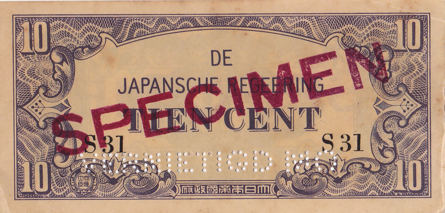 10 Cent z.j. Japanse bezetting. Specimen + perforatie “VERNIETIGD MO”. Pick 121s; PL NI-25.3s1 [# S31]. Prachtig.