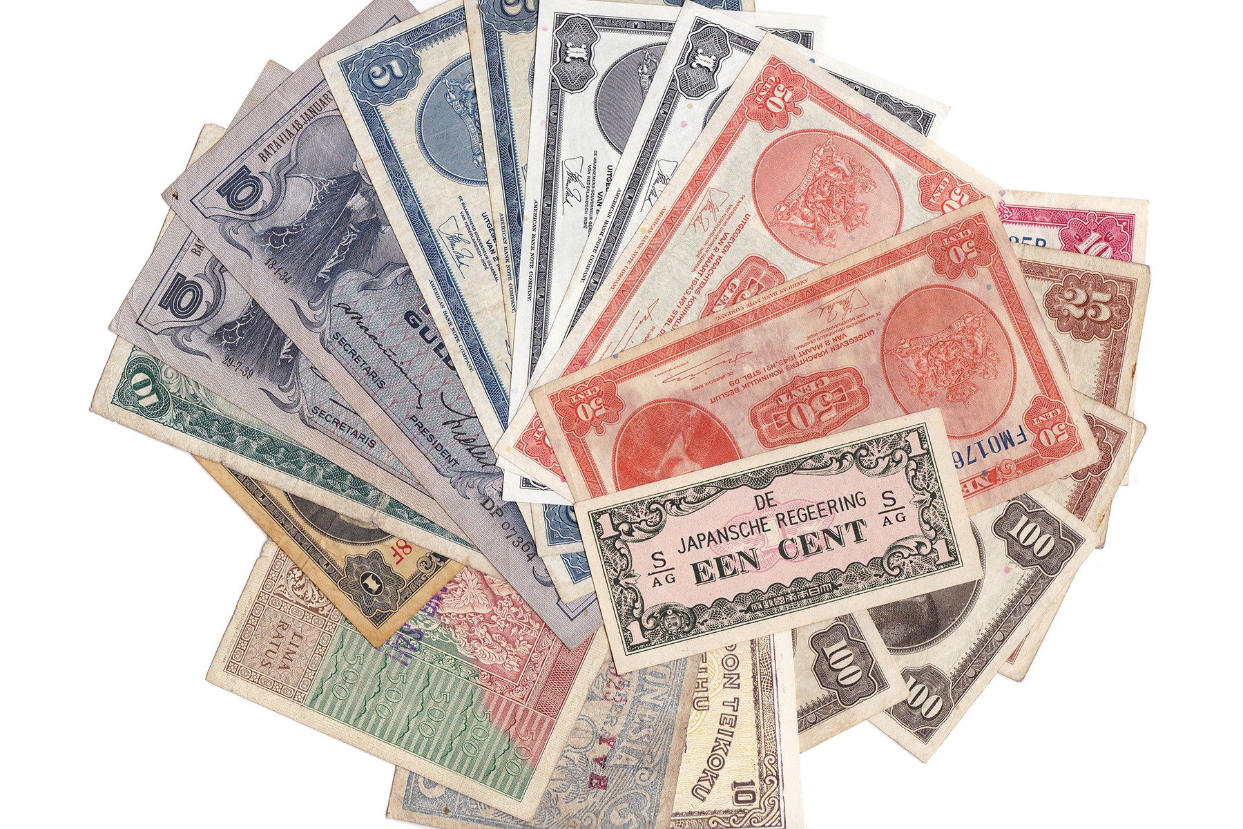 Blauw album met kleine collectie Nederlands-Indië (ca. 20 stuks). Diverse kwaliteiten.
