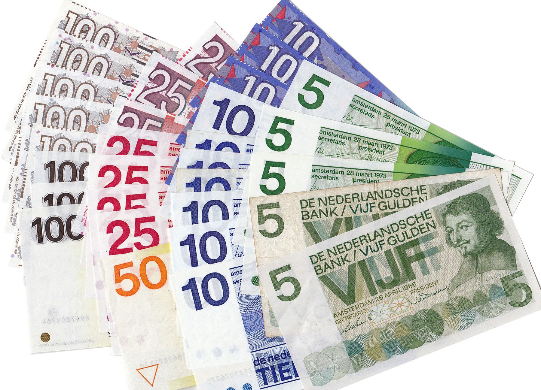 Nog inwisselbare guldenbiljetten van Hfl. 5,- t/m Hfl. 100,-. De meeste UNC. Totaal: Hfl. 1150,-