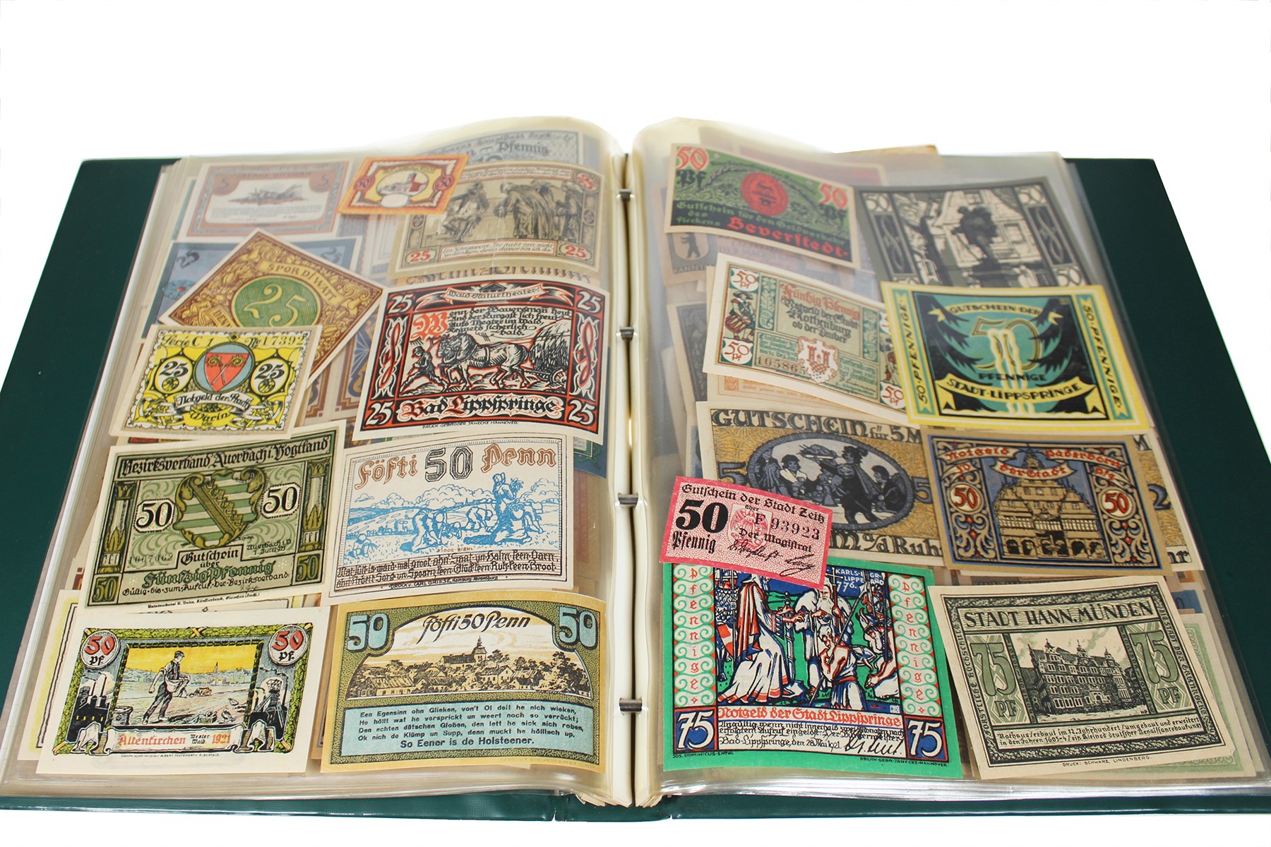 Groen album met restcollectie van enige miljoenen aan Duits inflatiegeld en steden Notgeld.