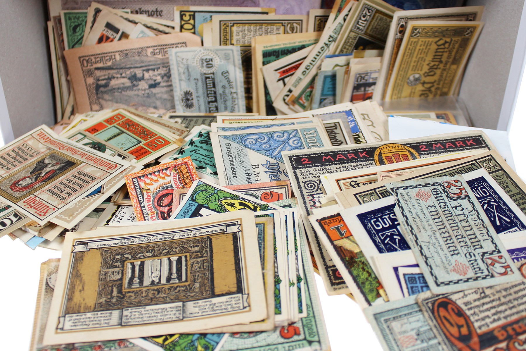 Schoenendoos vol met bankbiljettenspul. Voornamelijk onuitgezocht Duits inflatie- en noodgeld. Banknoten A t/m Z.