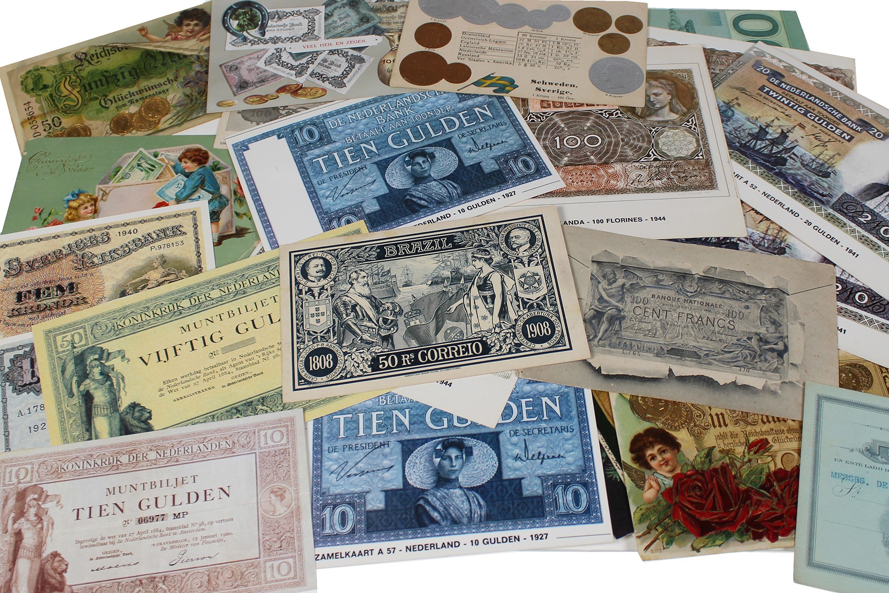 Map met ca. 30 ansichtkaarten met als onderwerp geld / bankbiljetten.