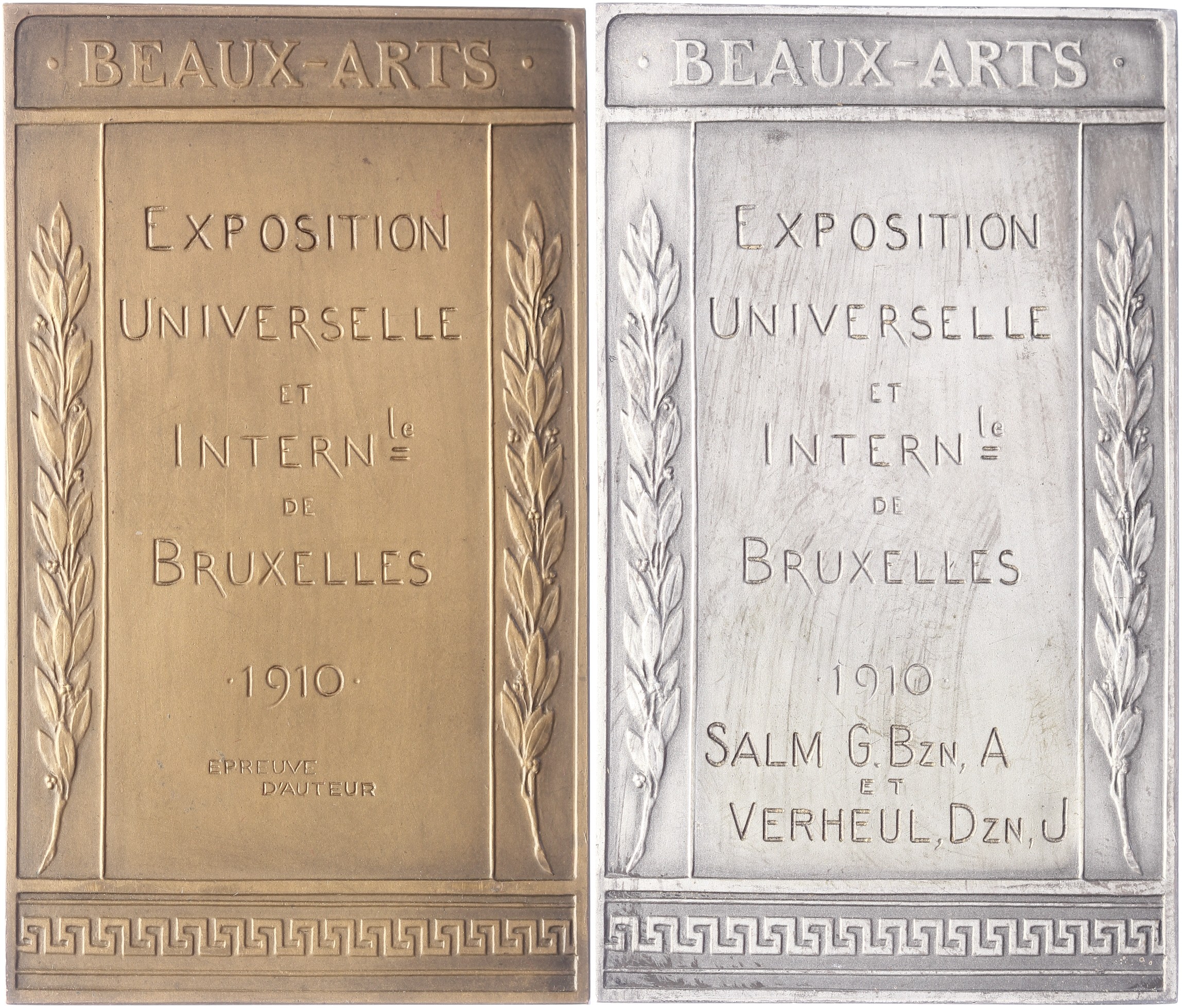 Lot (2) 1910 Brussel, internationale tentoonstelling schone kunsten. Naakte vrouw en man bij rots. / Inscriptieruimte binnen sierrand van lauriertakken. Æ (“EPREUVE D’AUTEUR”) en Æ verzilverd (o.n.v. G. Salm en J. Verheul) 82 x 48. Willenz 106; PVD 115. Prachtig.