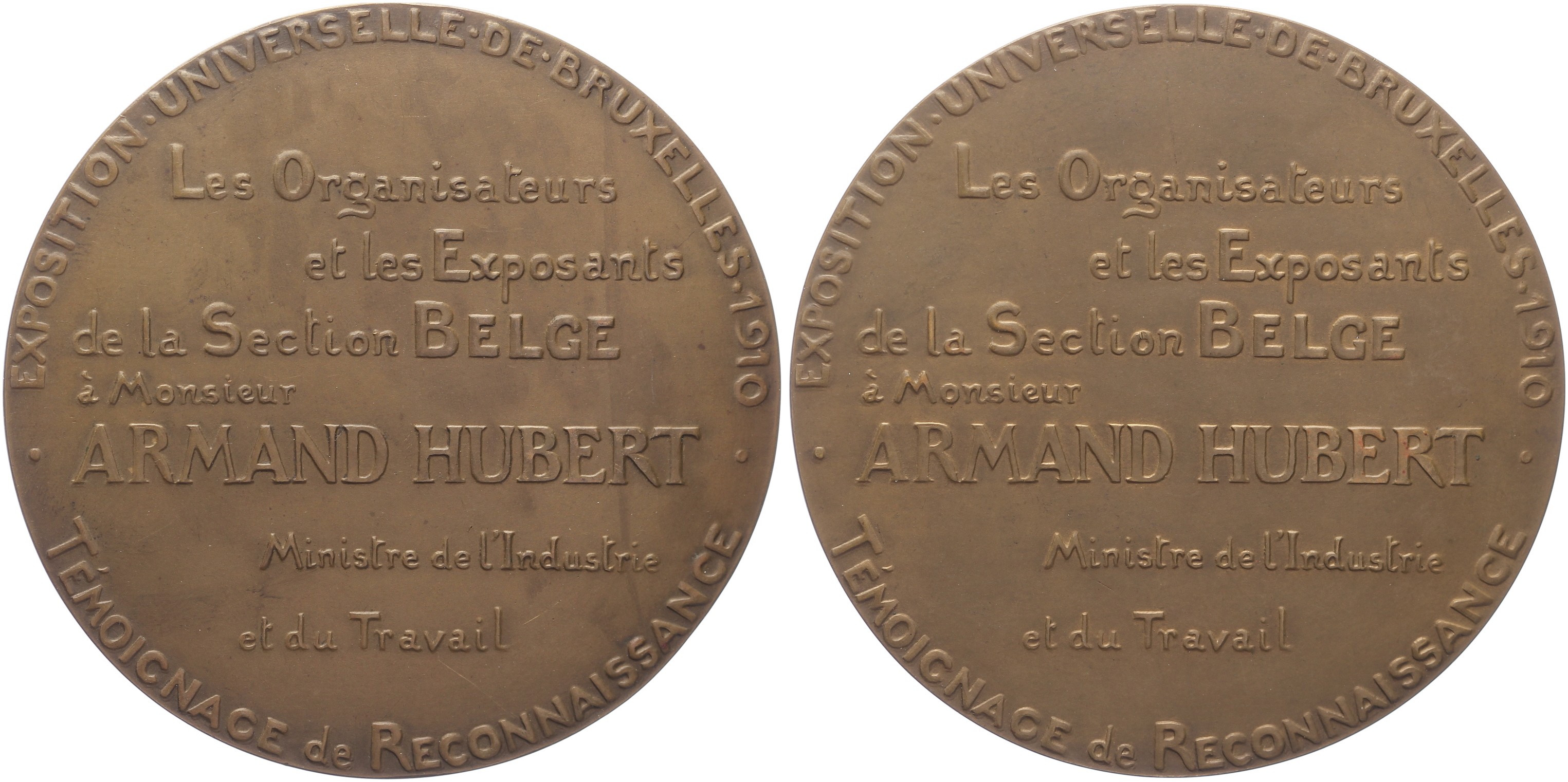 Lot (2) 1910 Ter ere van Armand Hubert, minister van Arbeid. Buste naar links. / Op- en omschrift. Æ 65. Willenz 110; PVD 119. Vlekje voorzijde. Prachtig.