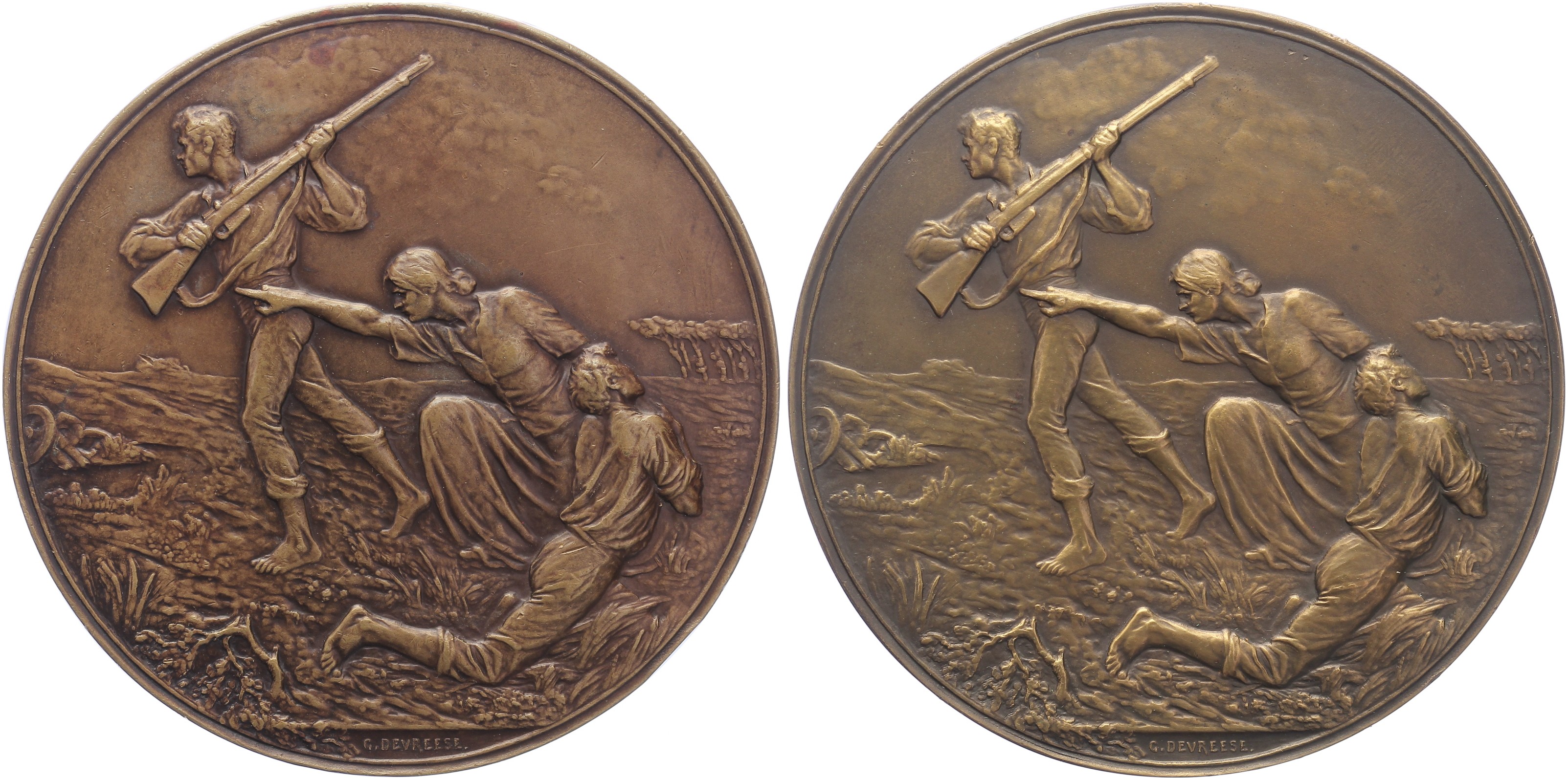 Lot (2) 1917 Heroïsche daden van onze zonen. Moeder ondersteunt haar stervende zoon en wijst soldaat de weg naar de vijand. / Dode soldaat op graftombe. Æ 90,5. Willenz 246; PVD 264. Zfr.