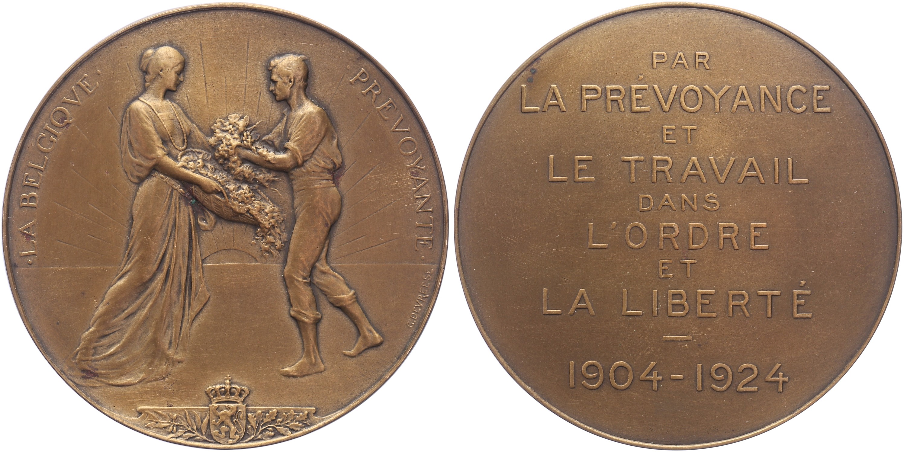 1924 Vooruitziend België. Staande man geeft vrouw diverse groentes (vz1). / Negenregelig opschrift. Æ 69,5. Willenz 264; PVD 282. Zeer fraai.