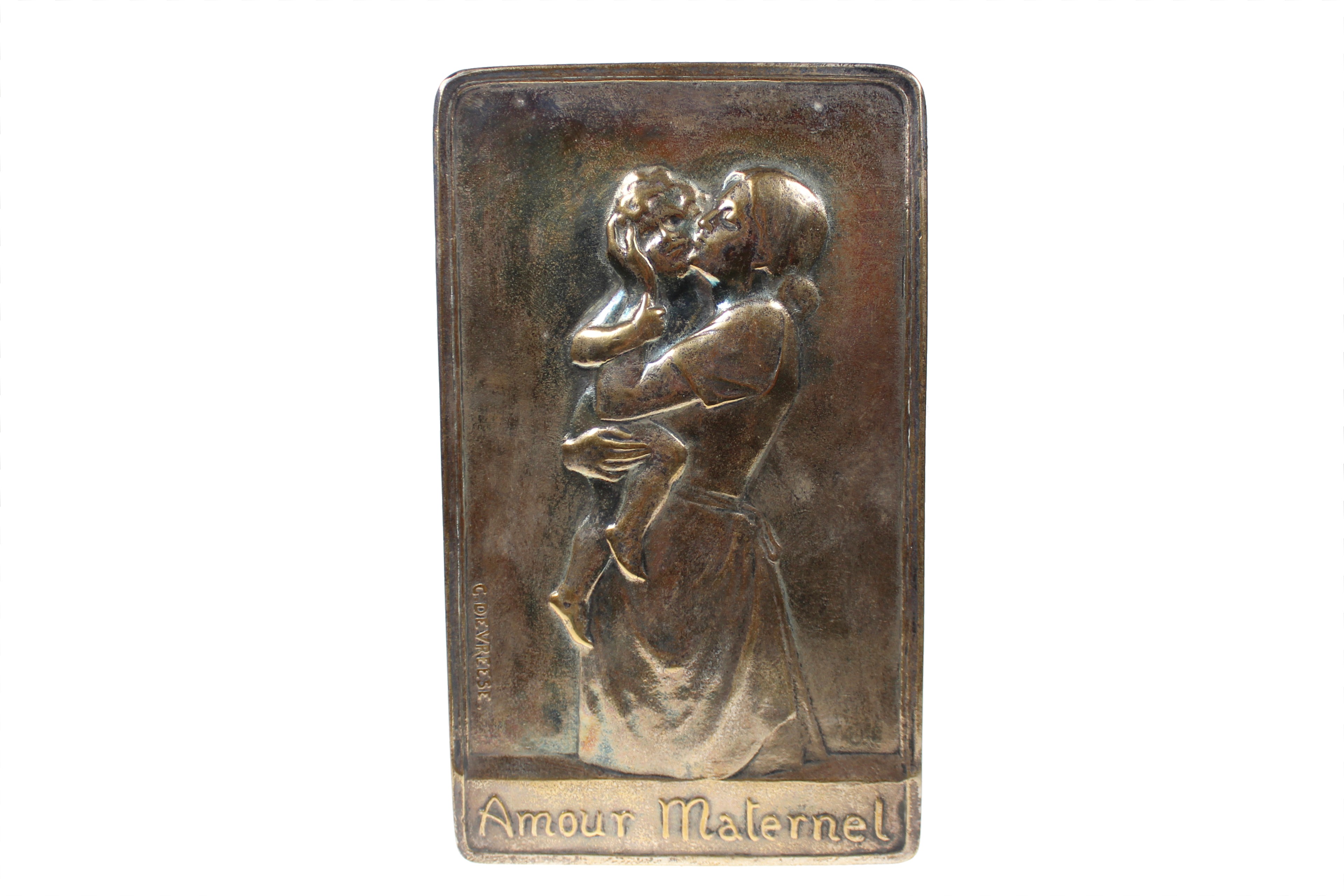 (1924) Moederliefde. Jonge moeder omhelst kind. / Blanco. Æ gegoten 245 x 145 (1,3 kg.). Willenz 266; PVD 284. Zeer fraai.