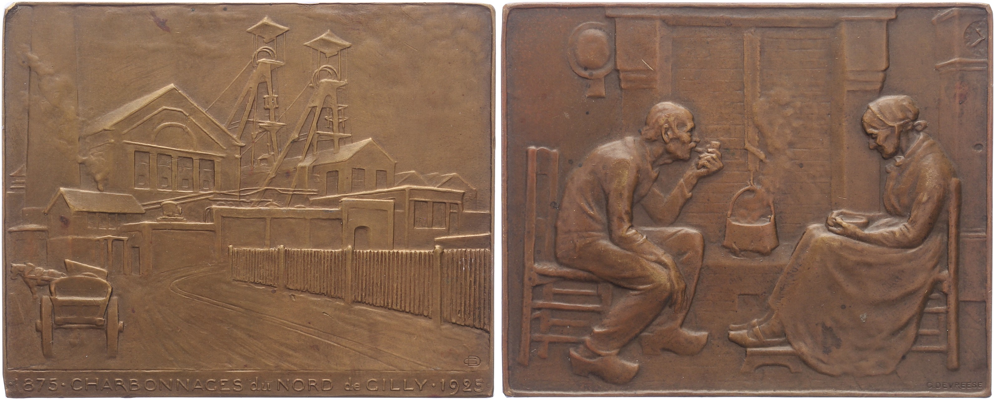 1925 “Charbonnages Du Nord De Gilly” 50 jaar. Steenkolenmijn. / Oud echtpaar bij open haard. Æ 74 x 59,6 met “EPREUVE D’AUTEUR” op rand. Willenz 269; PVD 289. Prachtig.