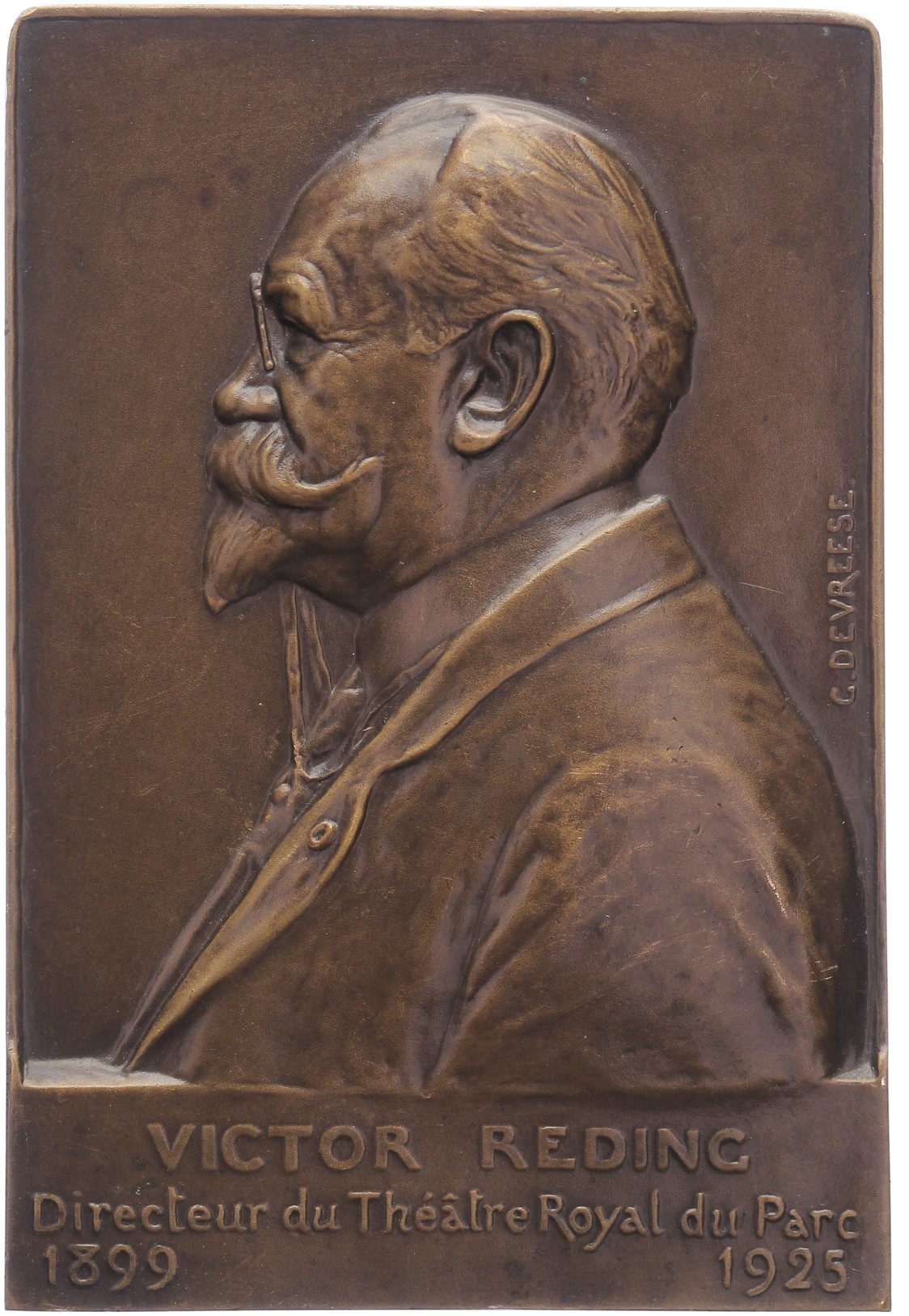 1925 Ter ere van Victor Reding, directeur Parktheater. Buste naar links. / Blanco. Æ 77,7 x 52,2. Willenz 272; PVD 292. Prachtig.