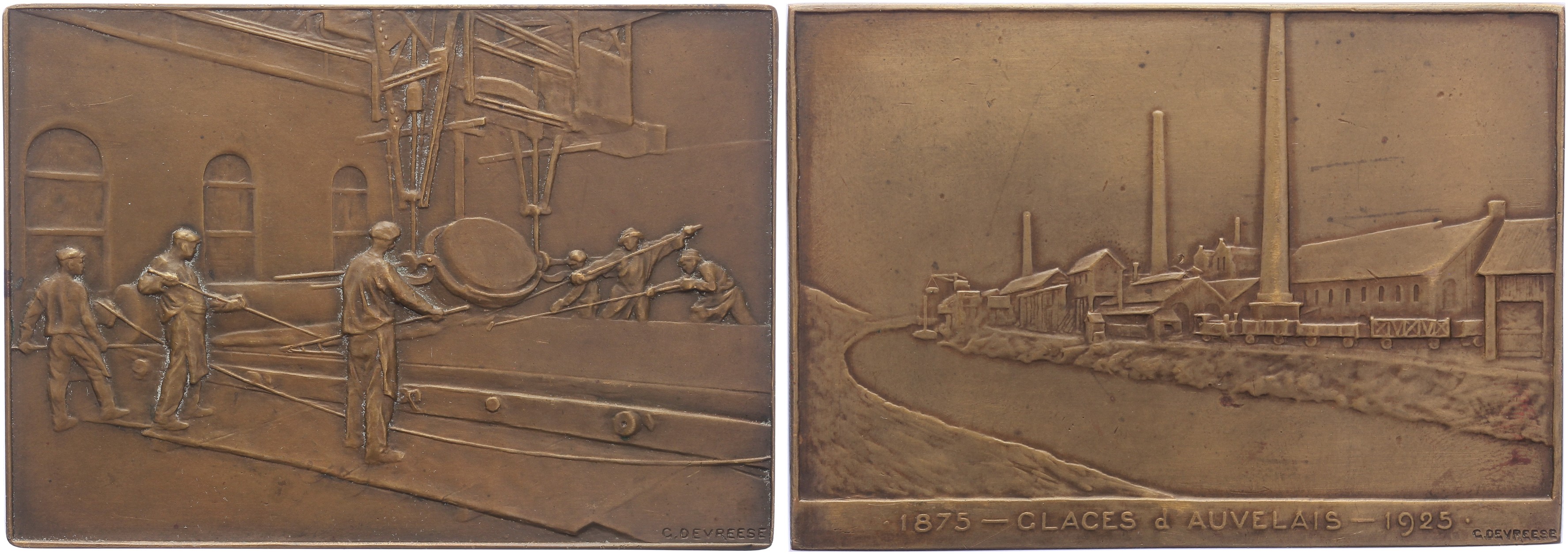 Lot (2) 1925 50 Jaar glasfabrieken van Auvelais. Interieur glasfabriek. / Exterieur glasfabriek aan rivier de Samber. Æ 84 x 60. Willenz 274; PVD 294. Zeer fraai.