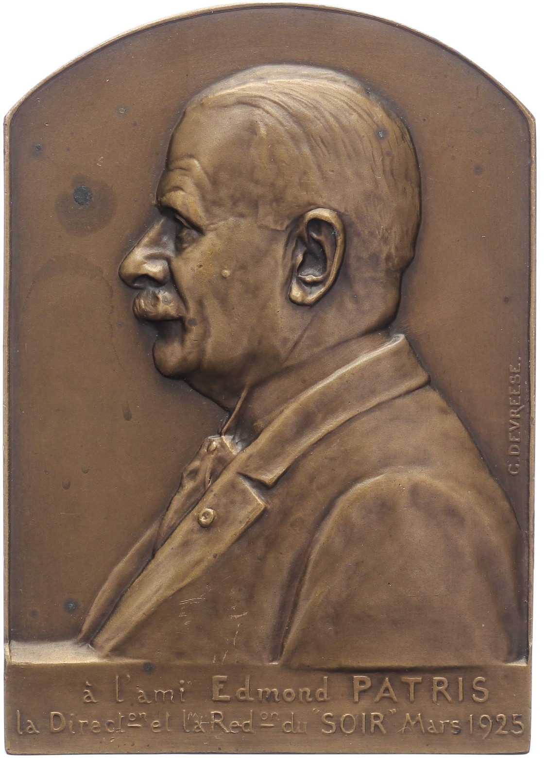 1925 Ter ere van Edmond Patris, journalist “Le Soir”. Buste naar links. / Blanco. Æ 74,6 x 52,8 met gebogen bovenkant. Willenz 277; PVD 297. Vlekje vz. Prachtig.