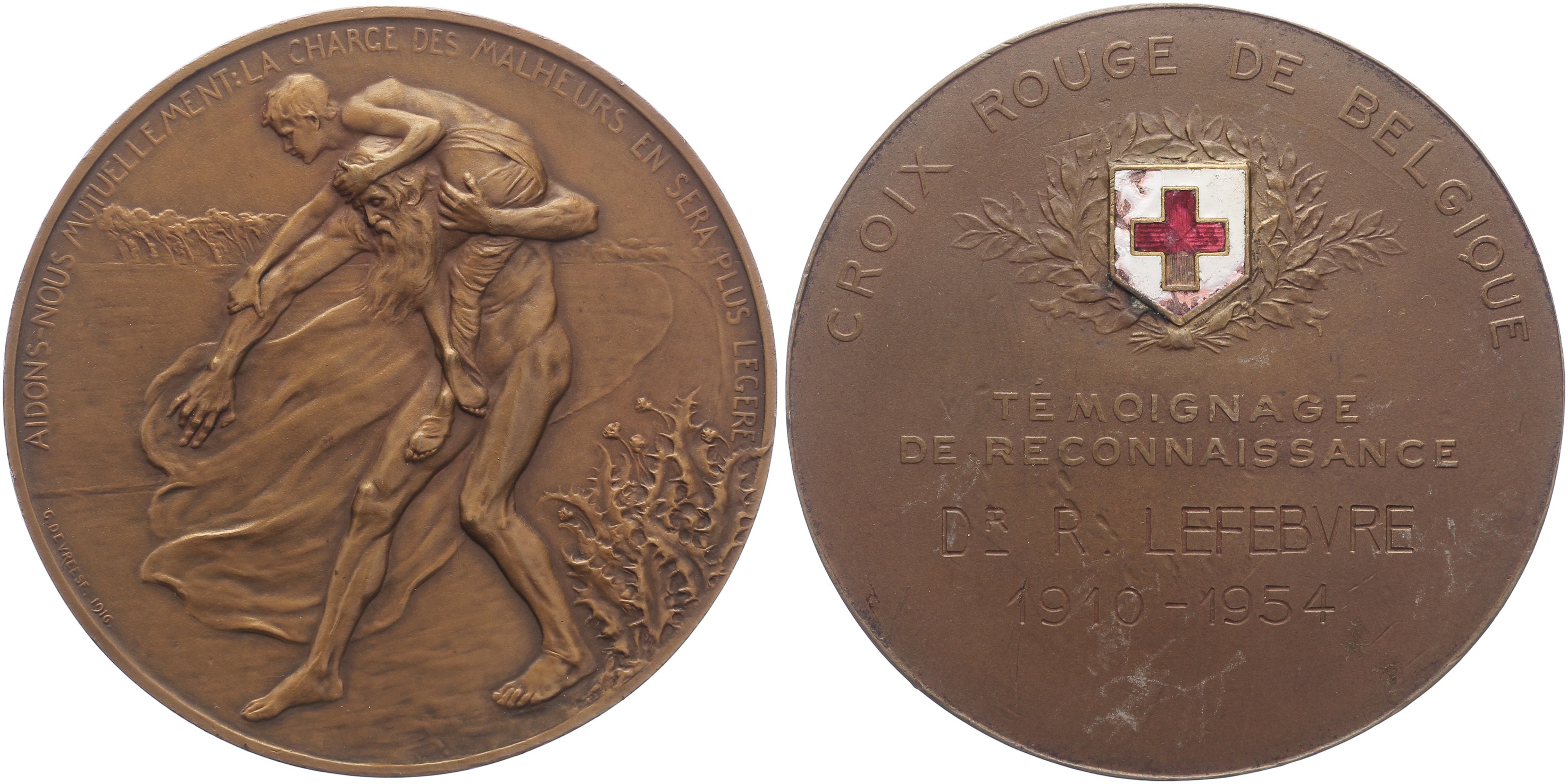 Lot (2) 1926, 1954 Rode Kruis van België. Voorstelling de blinde leidt de lamme. / Tekst en geëmailleerd kruis (kz + kz1). Æ 70. Willenz 285; PVD 304. Zeer fraai + Prachtig.
