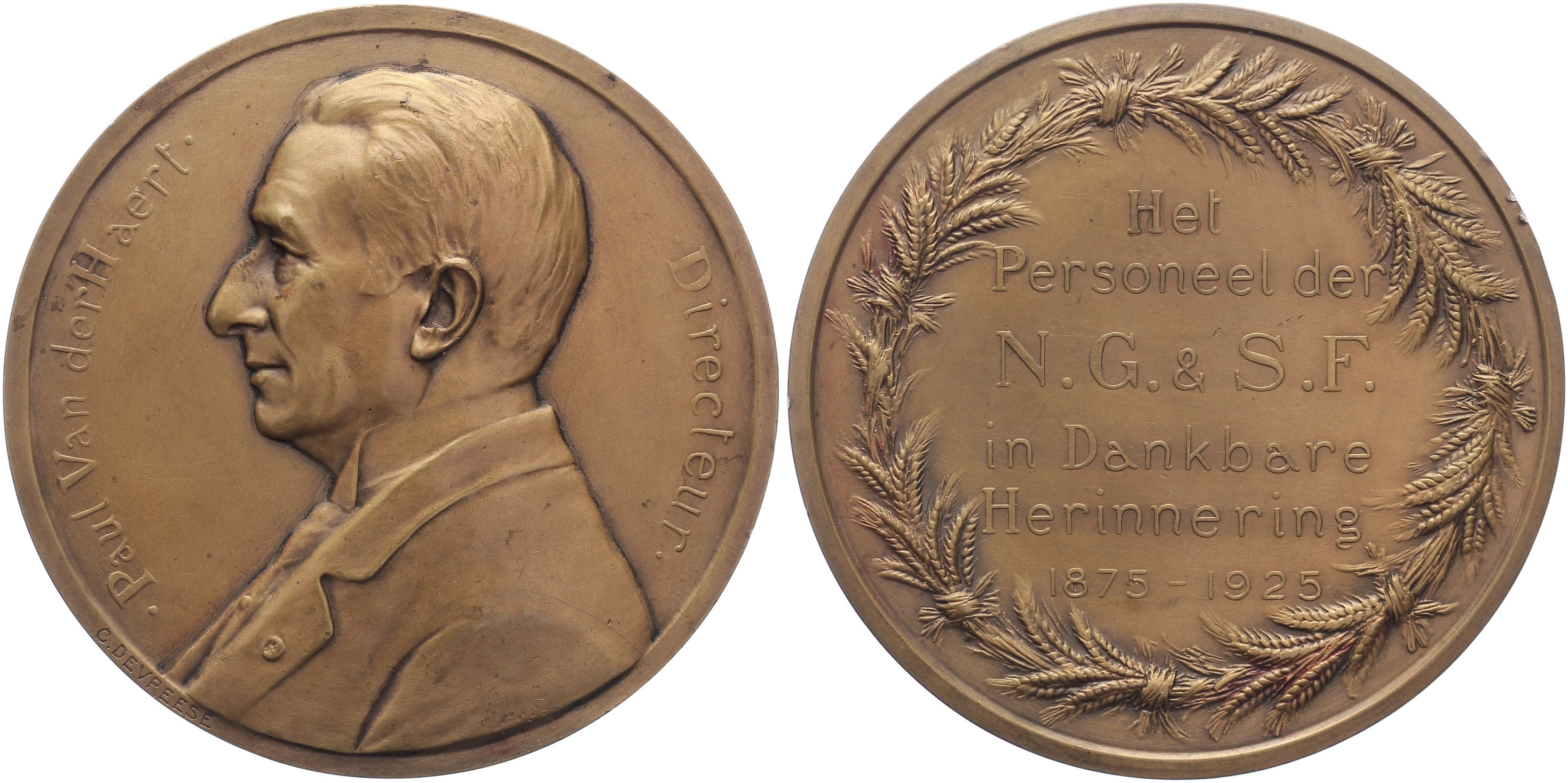 1925 Ter ere van Paul van der Haert, directeur N.G. & S.F. Buste naar links. / Zesregelig opschrift binnen krans van korenaren. Æ 70. Willenz 290; PVD 309. Zeer fraai.