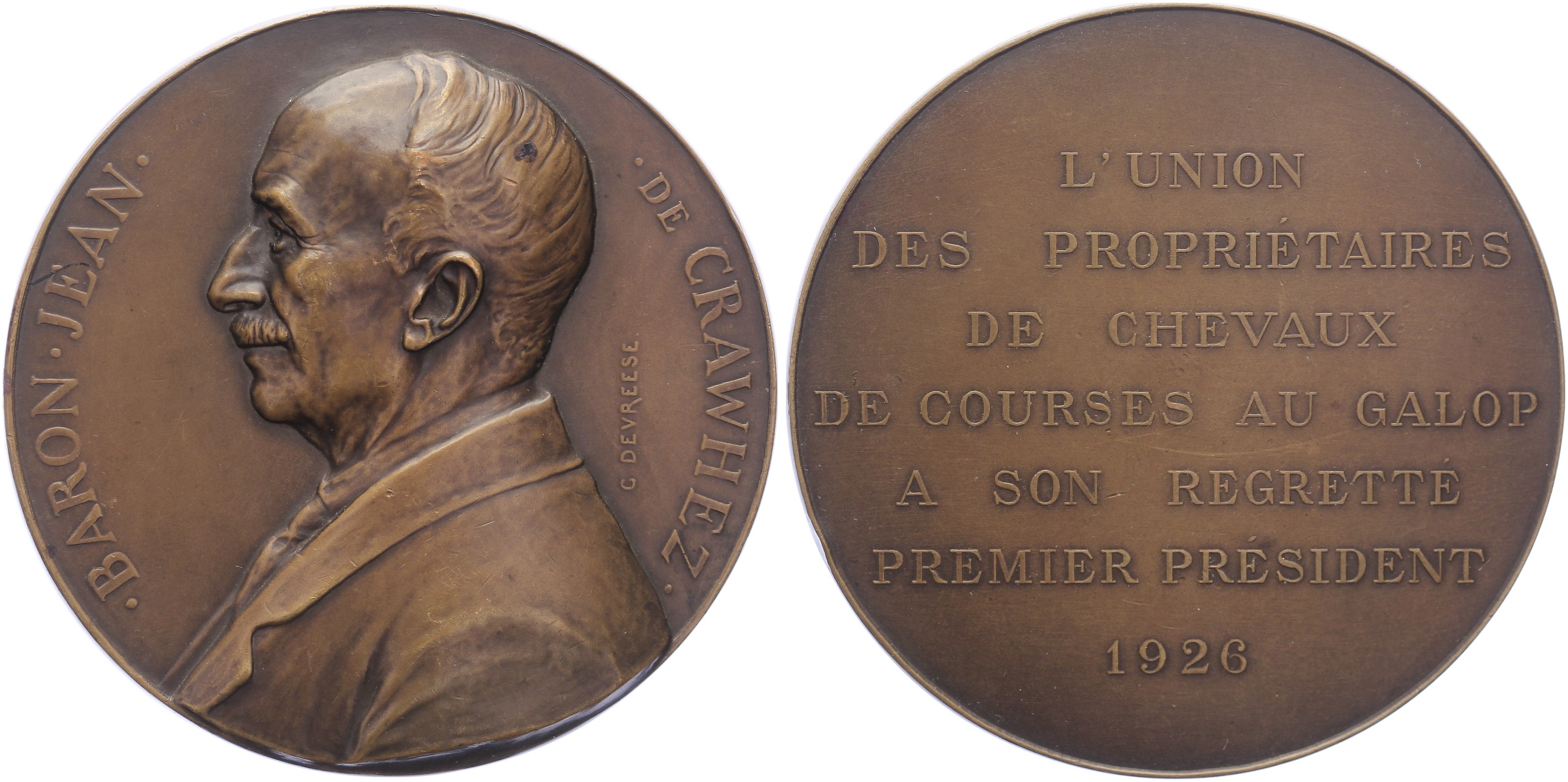 1926 Ter ere van baron Jean de Crawhez, paardenfokker. Buste naar links. / Zevenregelig opschrift. Æ 70,5. Willenz 292; PVD 311. Prachtig.