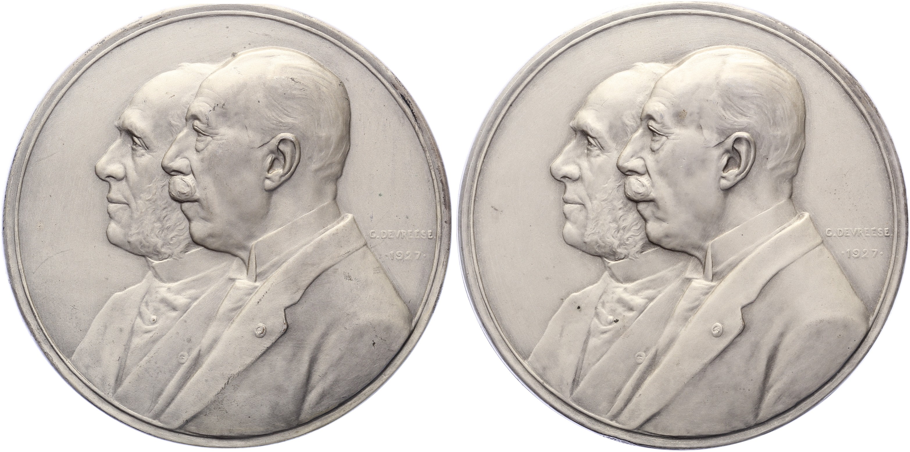 Lot (2) 1927 Ter ere van Louis & Gaston Calley Saint-Paul de Sinçay, mijningenieurs. Dubbelportret naar links. / Wapenschild “La Vieille Montagne”. Æ verzilverd 74,8. Müseler 5.1/18; Willenz 298; PVD 318. Prachtig.
