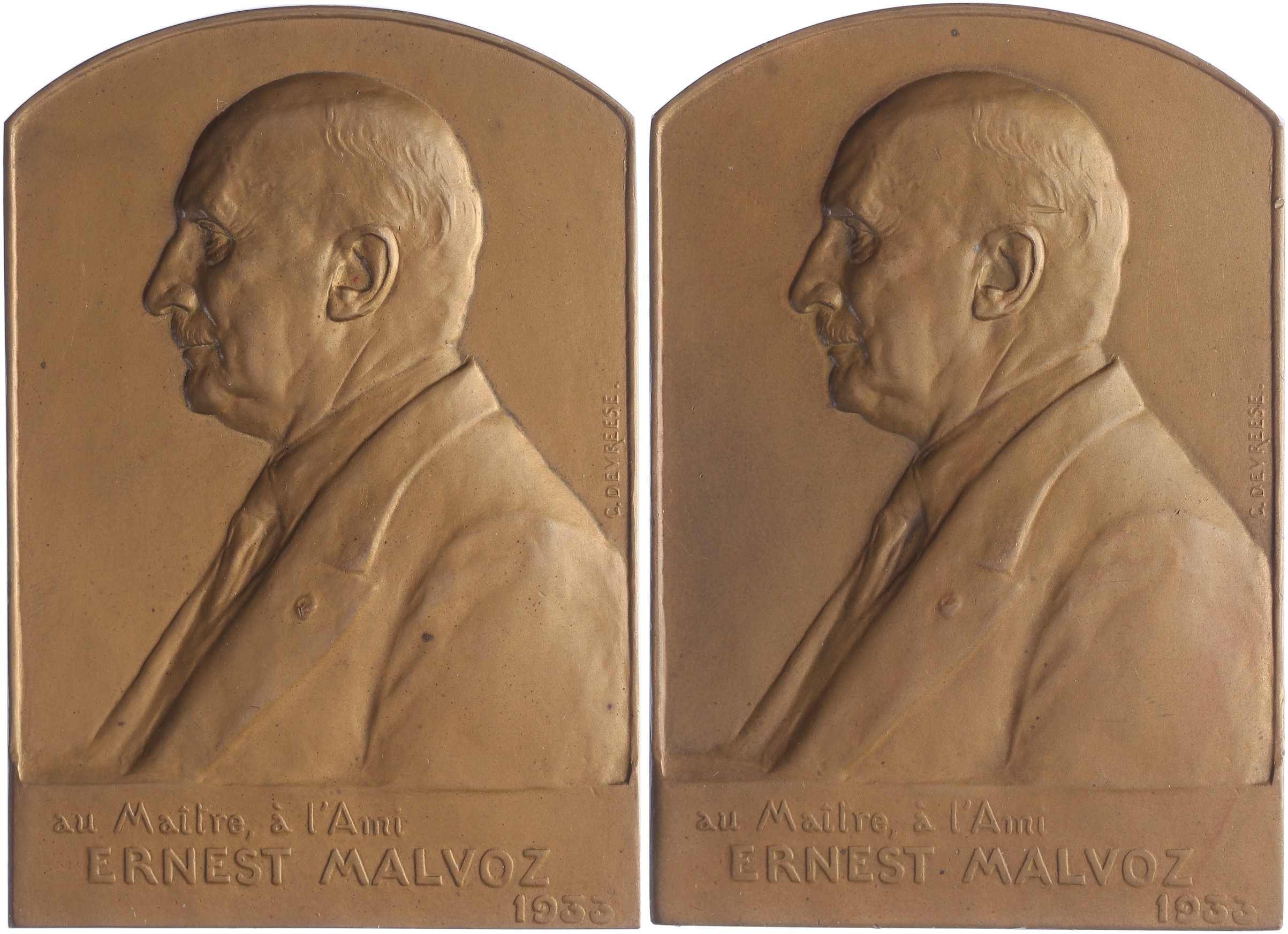 Lot (2) 1933 Ter ere van Ernest Malvoz, hoogleraar universiteit Luik. Buste naar links. / Blanco. Æ 75 x 52 met gebogen bovenkant. Willenz 366; PVD 384. Prachtig.
