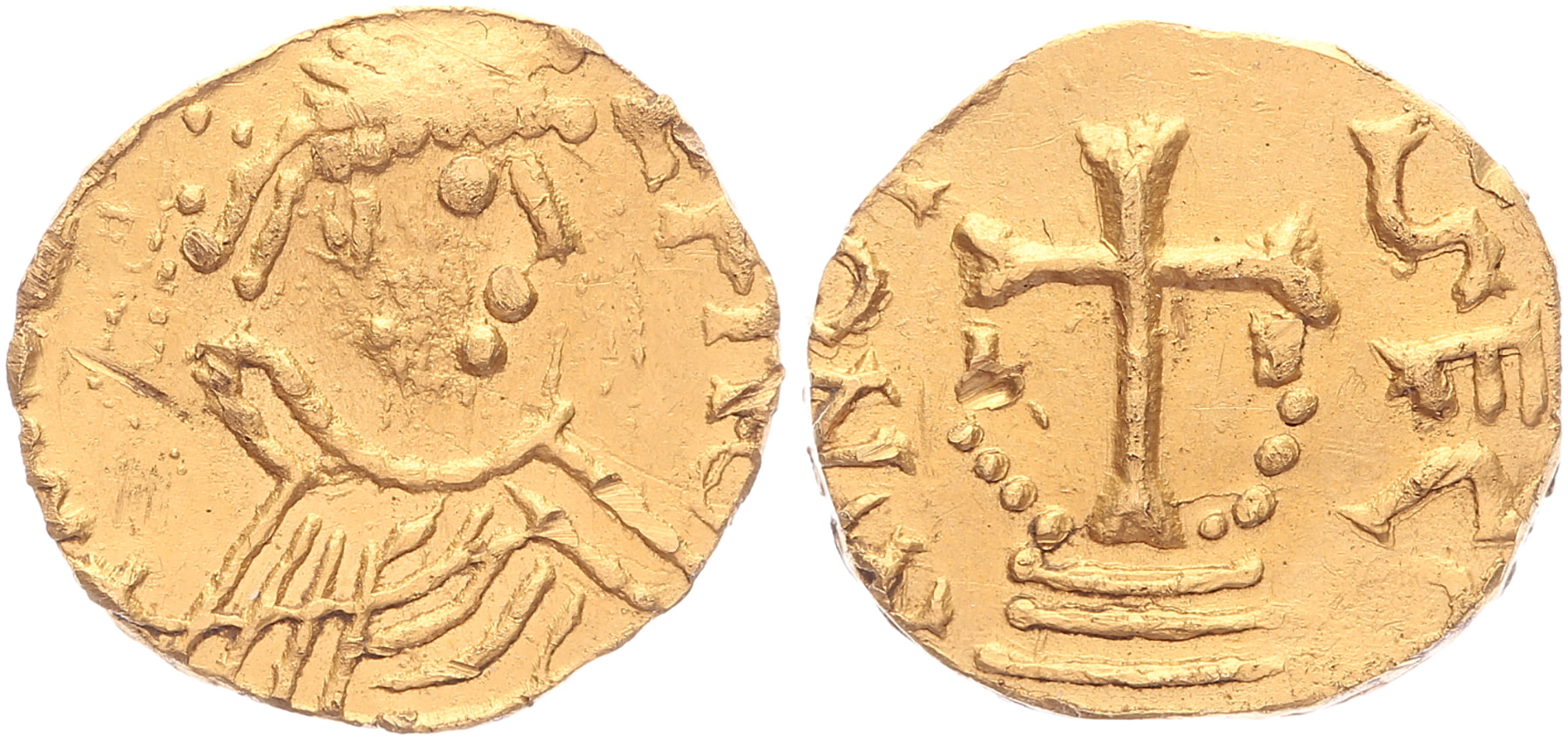 Gouden triens [1,16 gram]. Donjum. Hoofd naar rechts. / Versierd kruis. Verbasterd type van Dorestad? Prachtig.