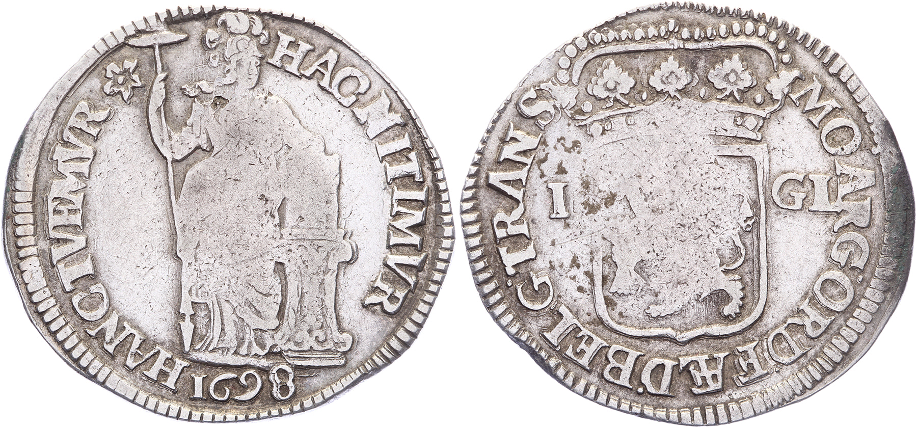 1 Gulden 1698. Delm. 1184; CNM 2.38.90. Zeldzaam. Ruim fraai.