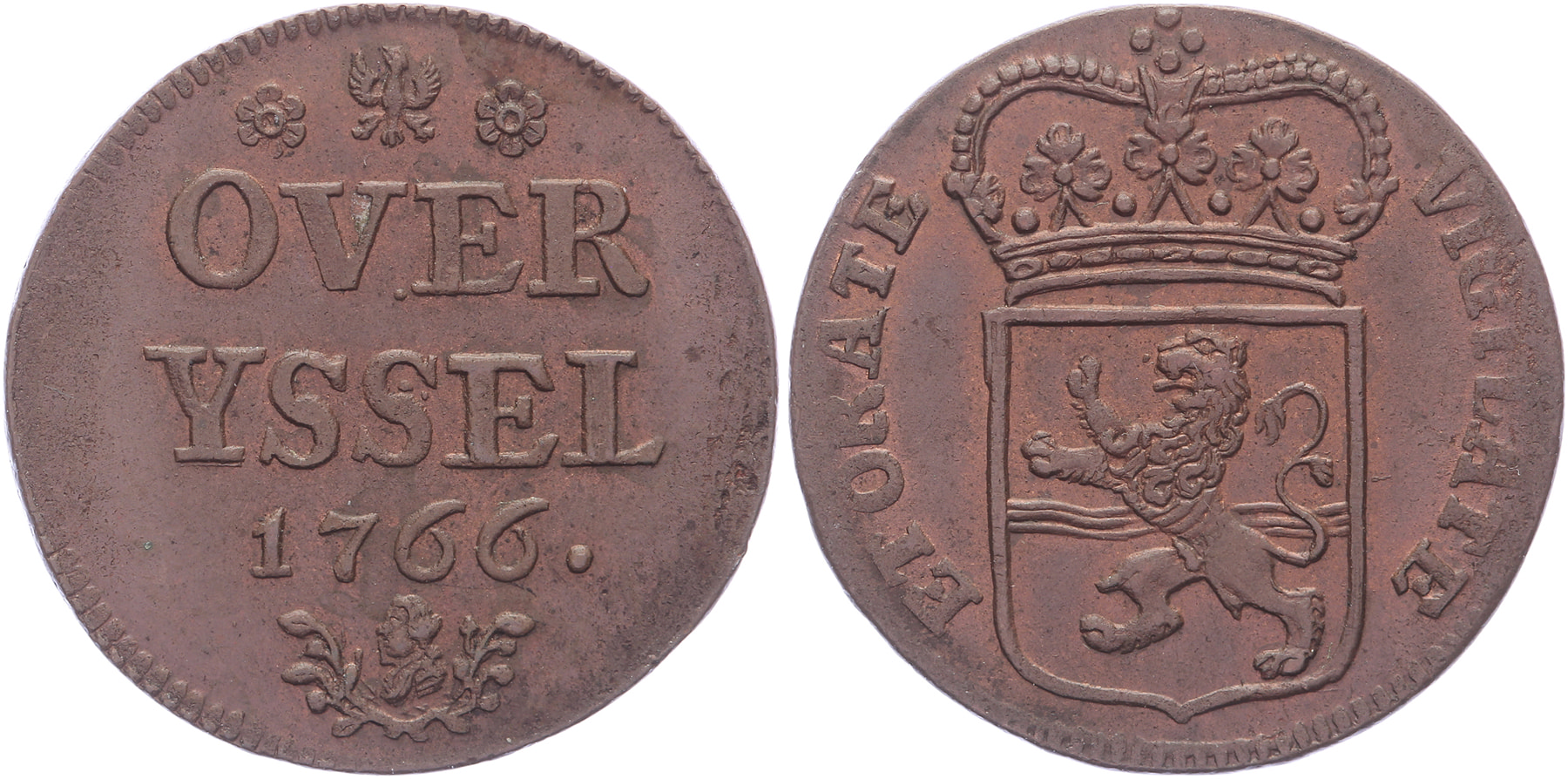 Duit 1766 met borstbeeld prins Willem V. PW 7010; CNM 2.38.116. Originele kleur. Vrijwel FDC.