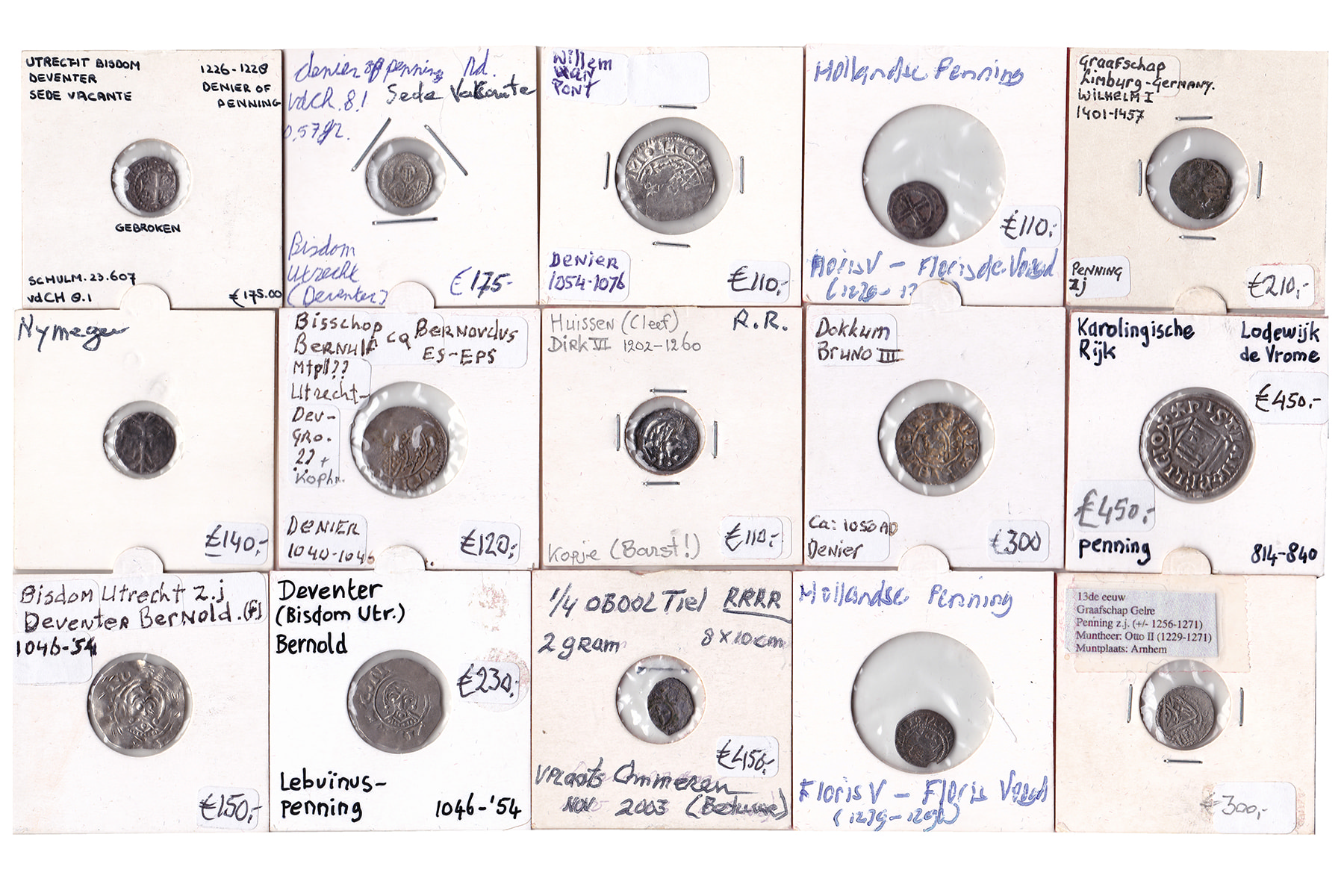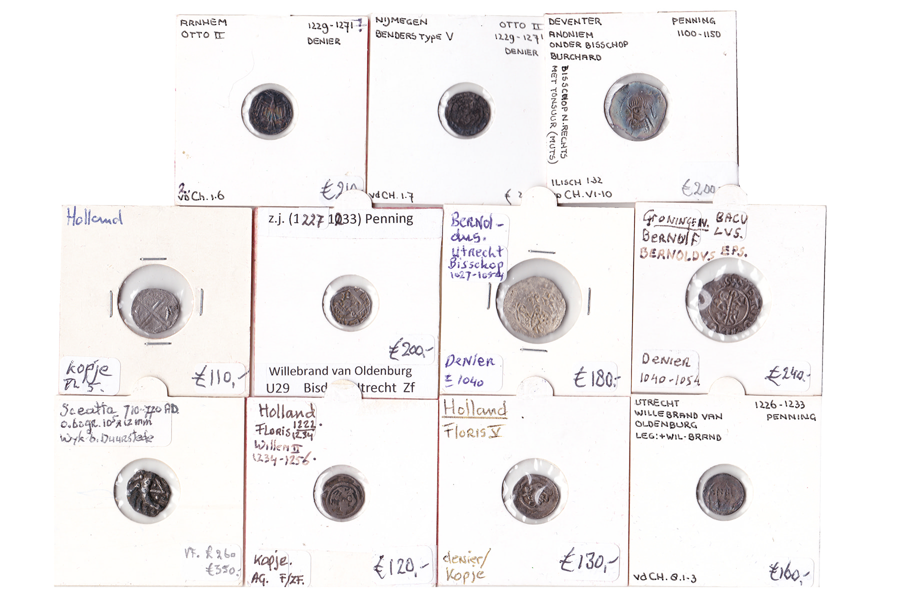 Lot (25) laatmiddeleeuwse munten, o.a. bisschoppelijke penninkjes Utrecht; Deventer, Nijmegen, Holland enz. Alle gedetermineerd.