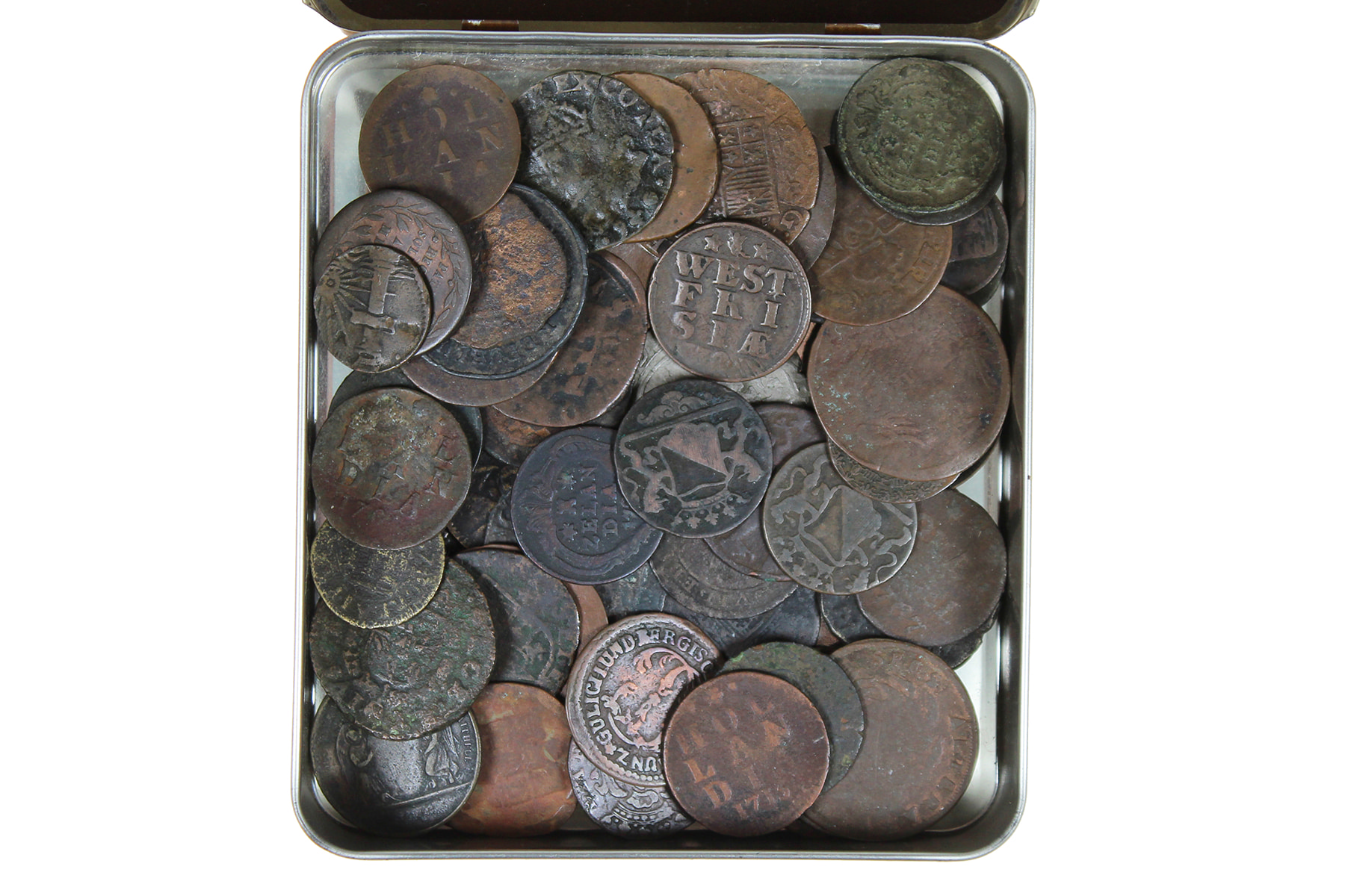 Blikje oud koper Nederland - België. Ca. 65 stuks. Matige kwaliteit.