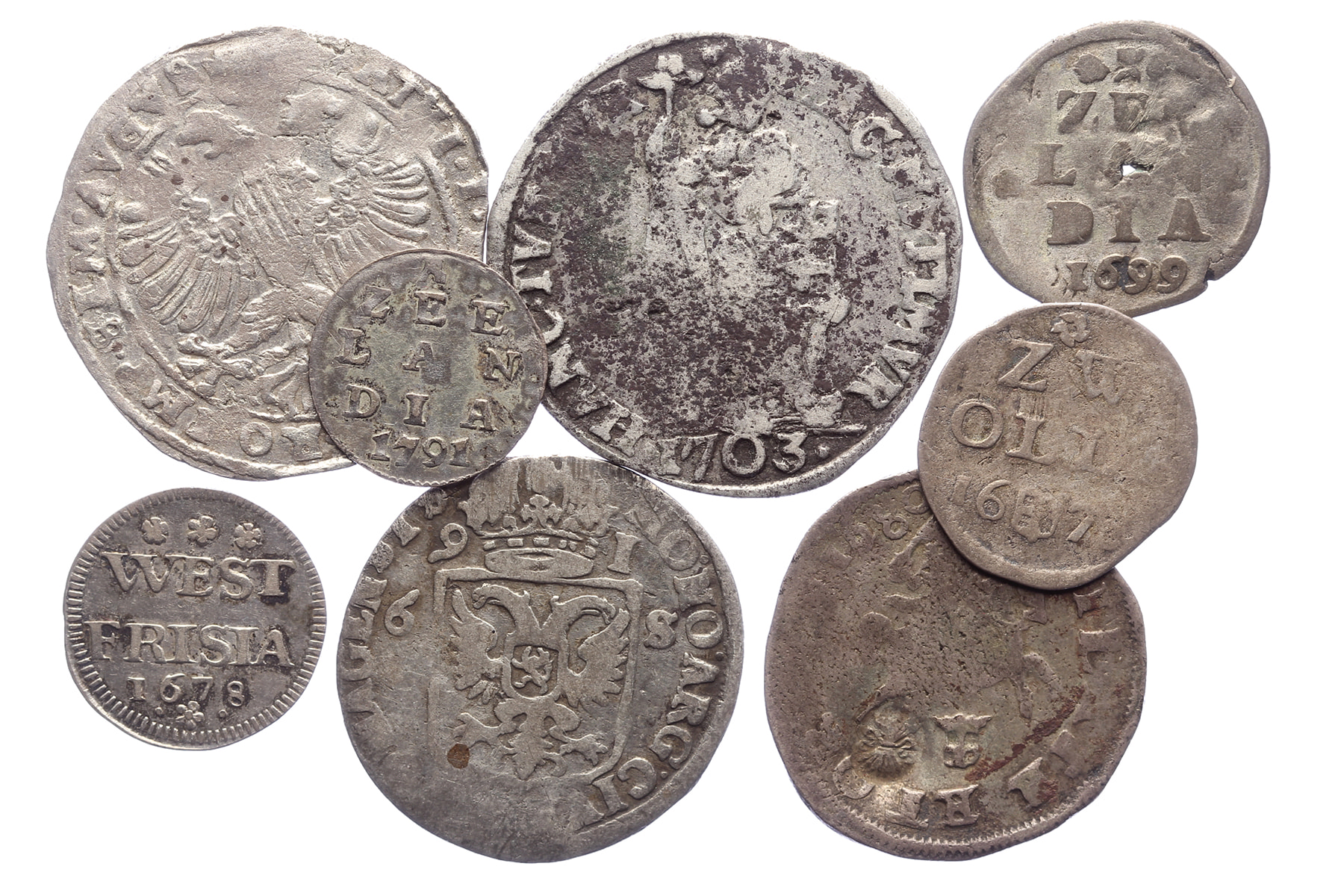 Doosje (8) met zilveren munten. Van bezemstuiver t/m gulden. Matige kwaliteiten.