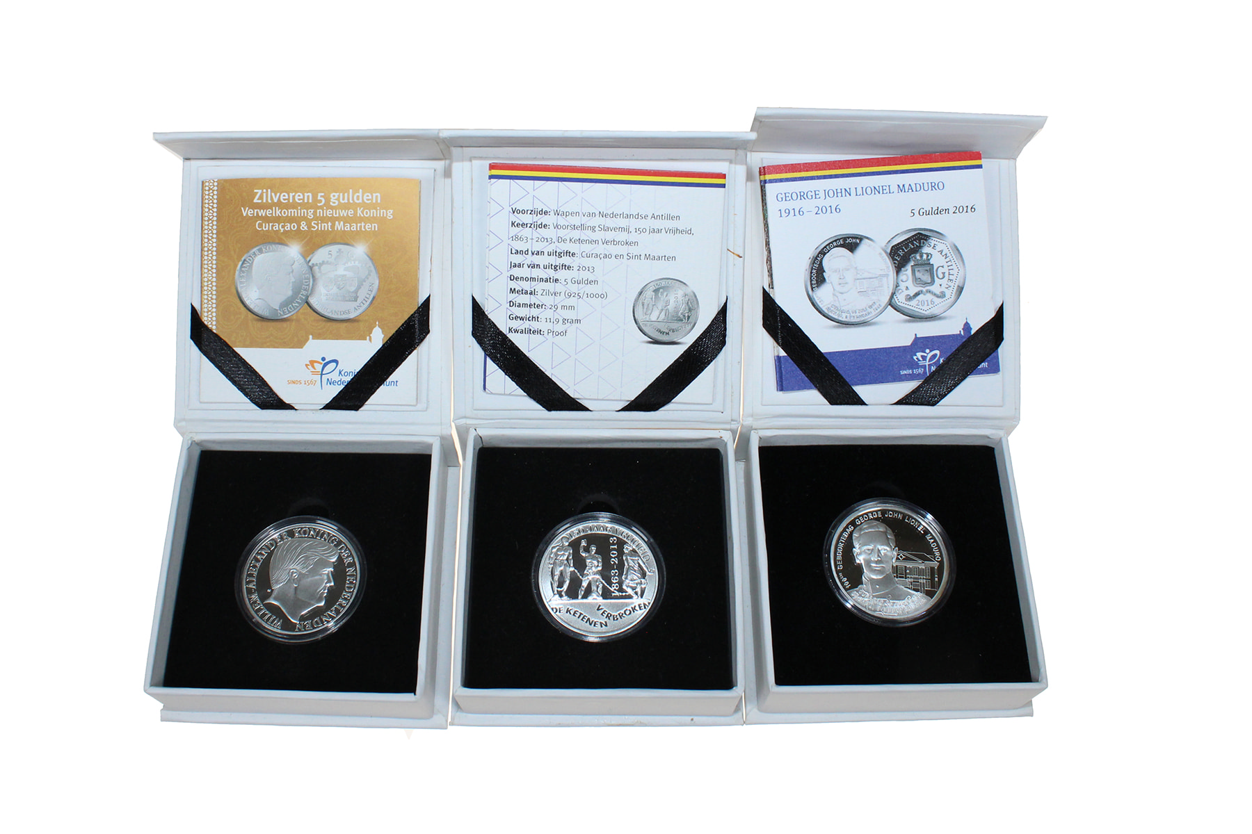 Lot (3) 5 Gulden 2013 - Verwelkoming nieuwe koning; 2013 - Afschaffing slavernij; 2016 - Geboortedag George Maduro. Proof in originele verpakking