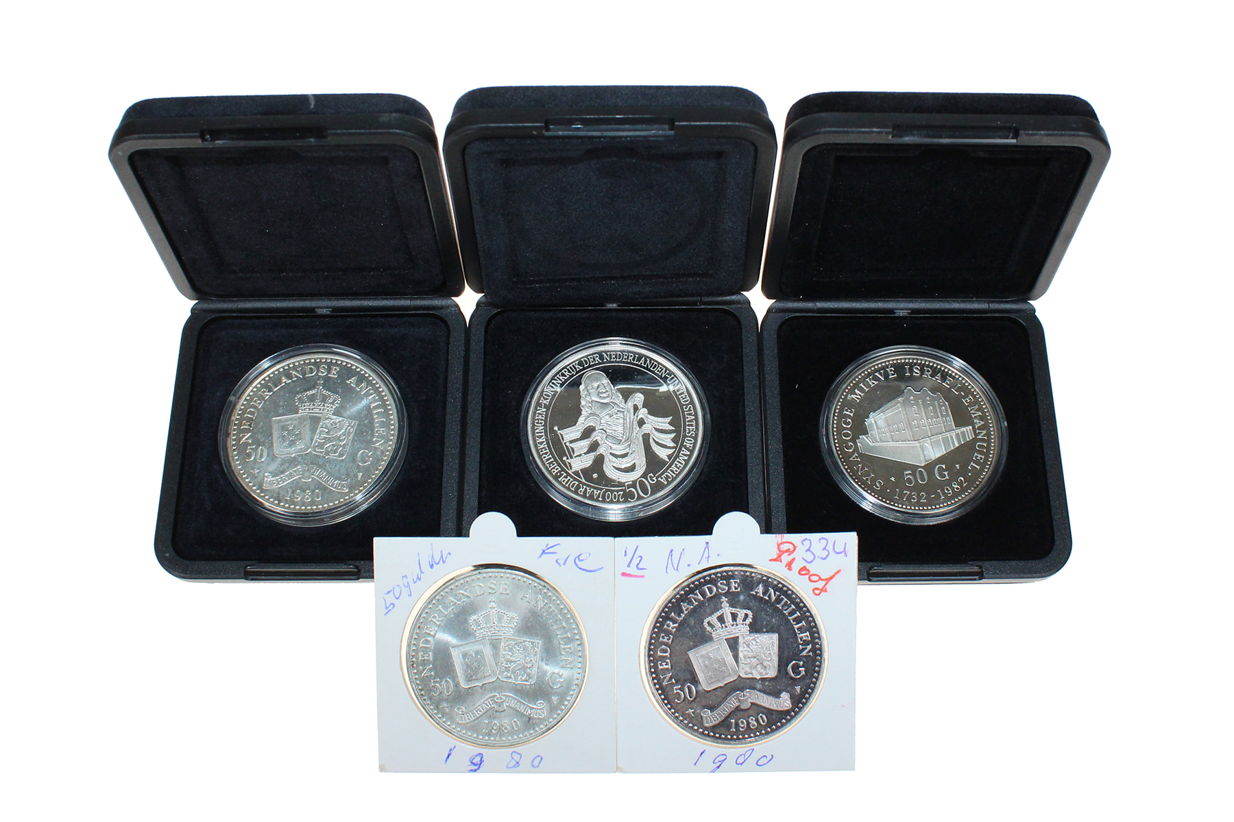 Lot (5) 50 Gulden 1980 - Beatrix (3); 1982 - 200 jaar Nederland - USA; 1983 - Synagoge. Diverse kwaliteiten.