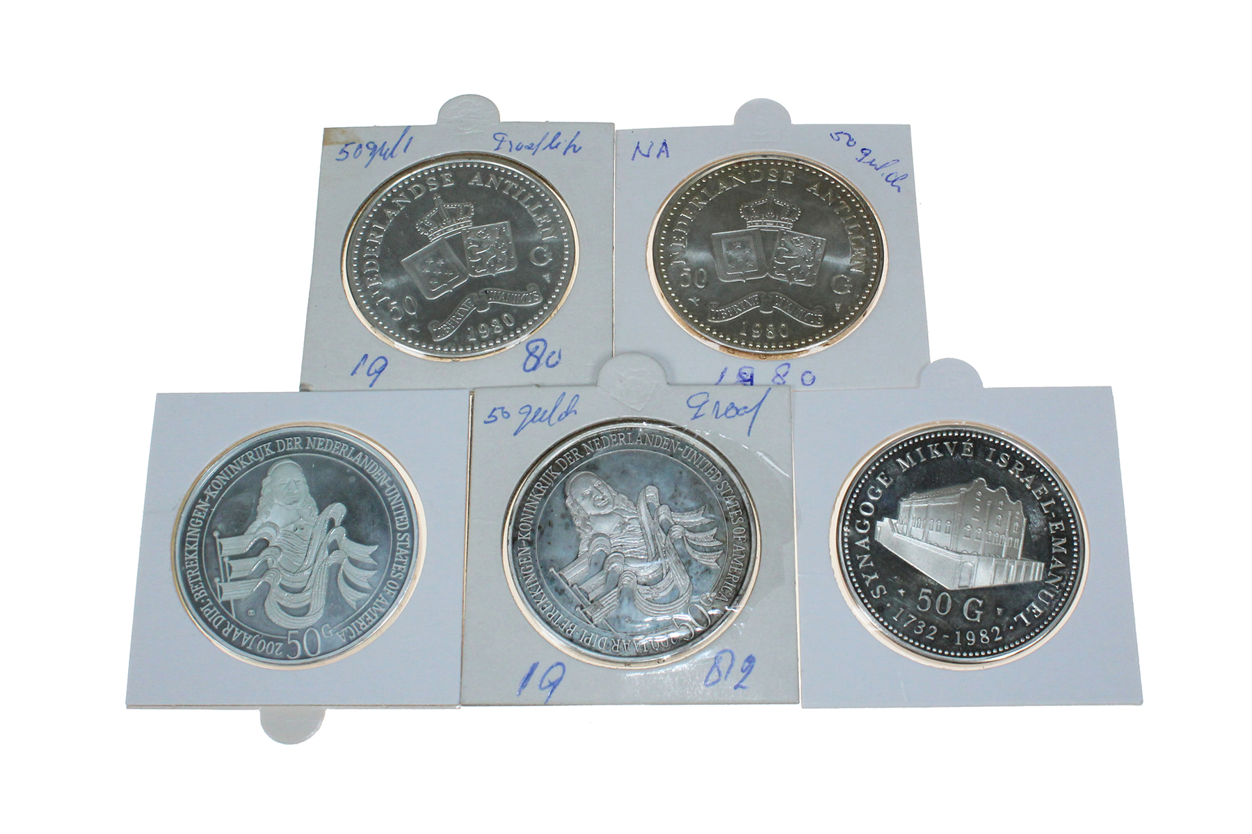 Lot (5) 50 Gulden 1980 - Beatrix (2); 1982 - 200 jaar Nederland - USA (2); 1983 - Synagoge. Diverse kwaliteiten.