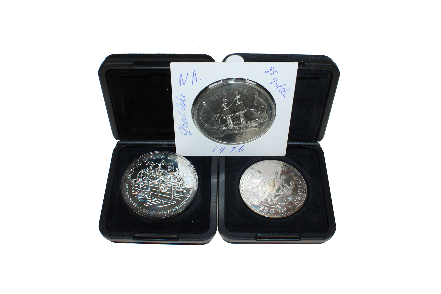 Lot (3) 25 Gulden 1973 - Postkoets; 1976 - Andrew Doria; 1979 - Spelende kinderen. Diverse kwaliteiten.