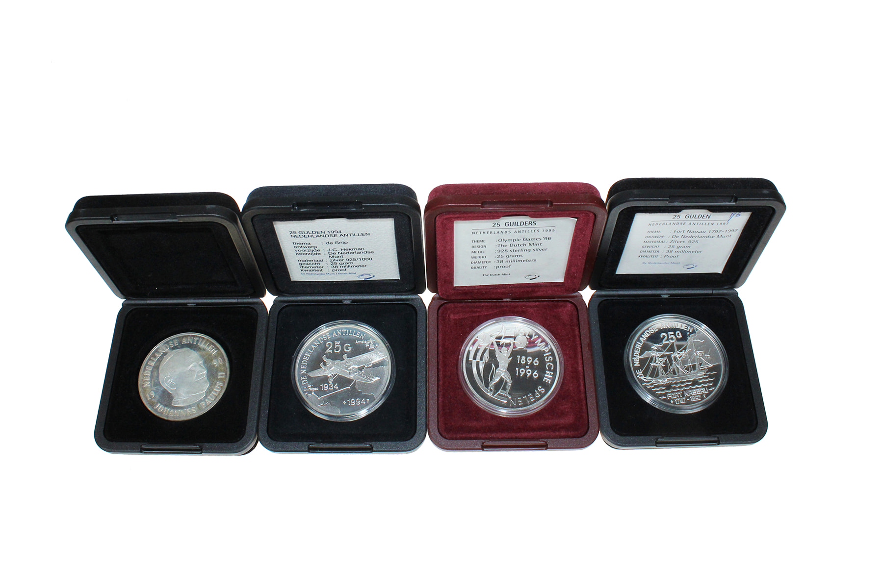 Lot (4) 25 Gulden 1990 - Pausbezoek; 1994 - De Snip; 1995 - Olympische Spelen Atlanta; 1997 - Fort Nassau. Proof in originele verpakking.