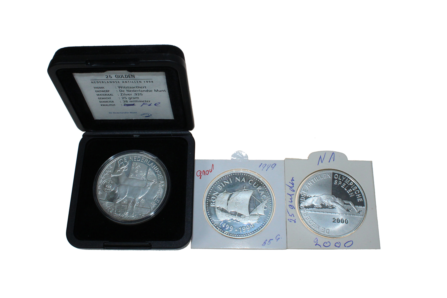 Lot (3) 25 Gulden 1998 - Witstaarthert; 1999 - Bon Bini Na Curaçao; 2000 - Olympische Spelen Sydney. Diverse kwaliteiten.