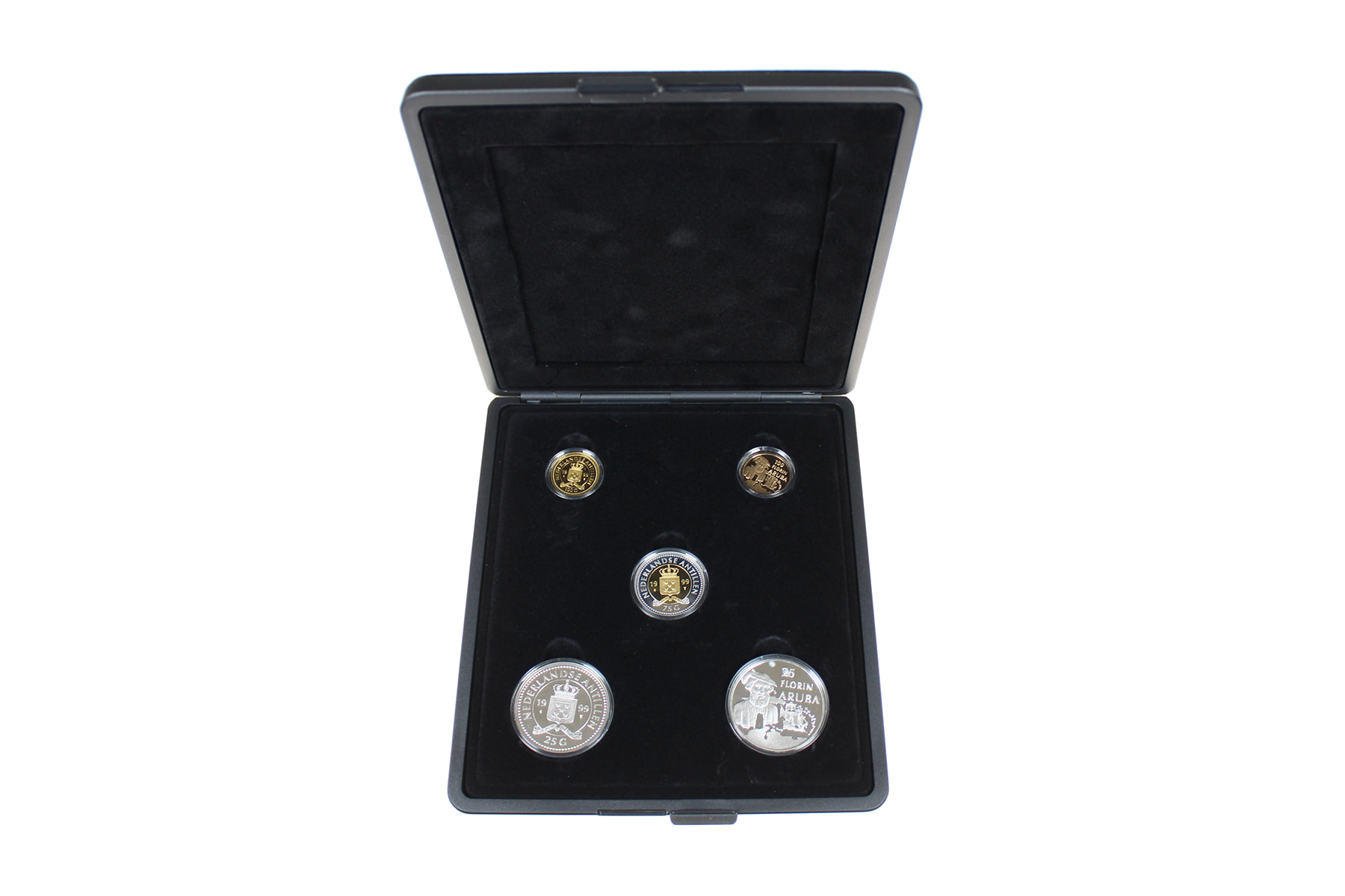 Set Nederlandse Antillen. 25 florin 1999 zilver; 25 gulden 1999 zilver; 75 gulden 1999 goud; 100 florin 1999 goud; 100 gulden 1999 goud. Proof in cassette.