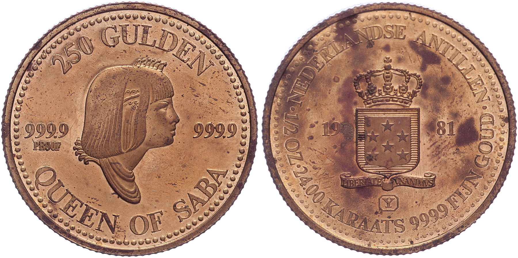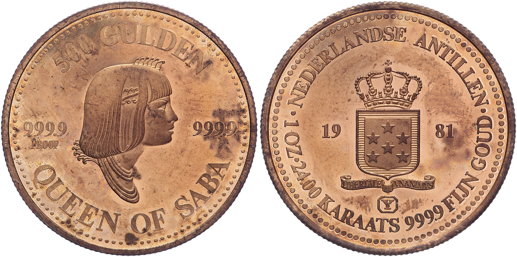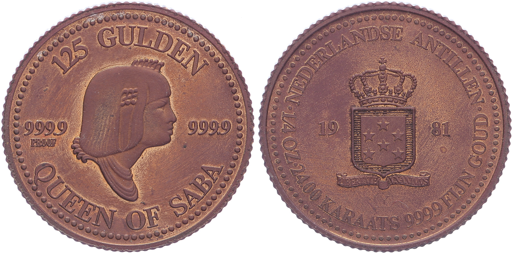Lot (3) Ontwerpserie van 3 proeven / patterns van 125, 250 en 500 gulden 1981 Y Queen of Saba - ¼ - ½ en 1 Ounce verguld brons met gepolijste stempels geslagen. KM PN 7, 9, 11.