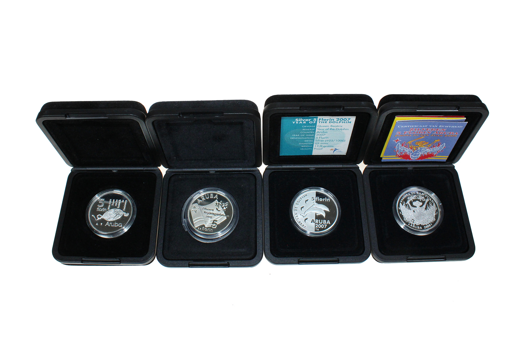 Lot (4) 5 Florin 2004 - Statuut Koninkrijk der Nederlanden; 2005 - Zilveren Regeringsjubileum; 2007 - Dolfijnen; 2008 - Fiesta San Juan. Proof in originele verpakking.