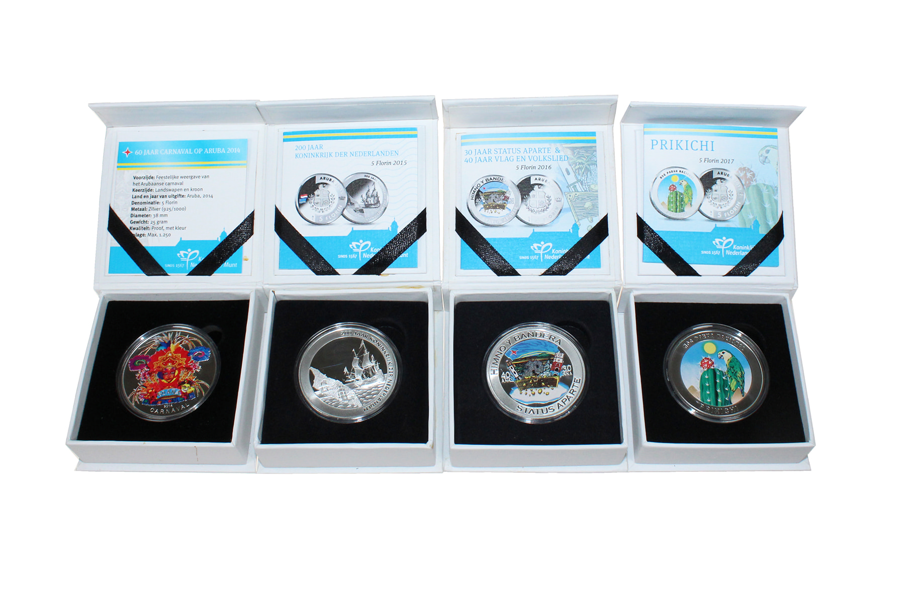 Lot (4) 5 Florin 2014 - Carnaval; 2015 - 200 jaar Koninkrijk; 2016 - 40 jaar vlag / 30 jaar Status Aparte; 2017 - Prikichi. Proof in originele verpakking.