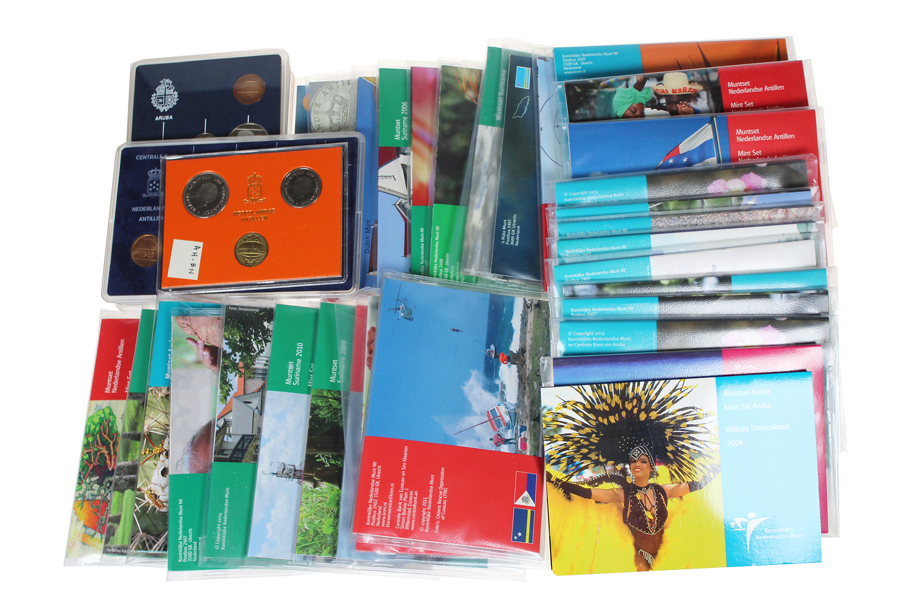 Kunststof box met ca. 40 stuks FDC-sets van o.a. Aruba, Nederlandse Antillen en overige overzeese gebiedsdelen.