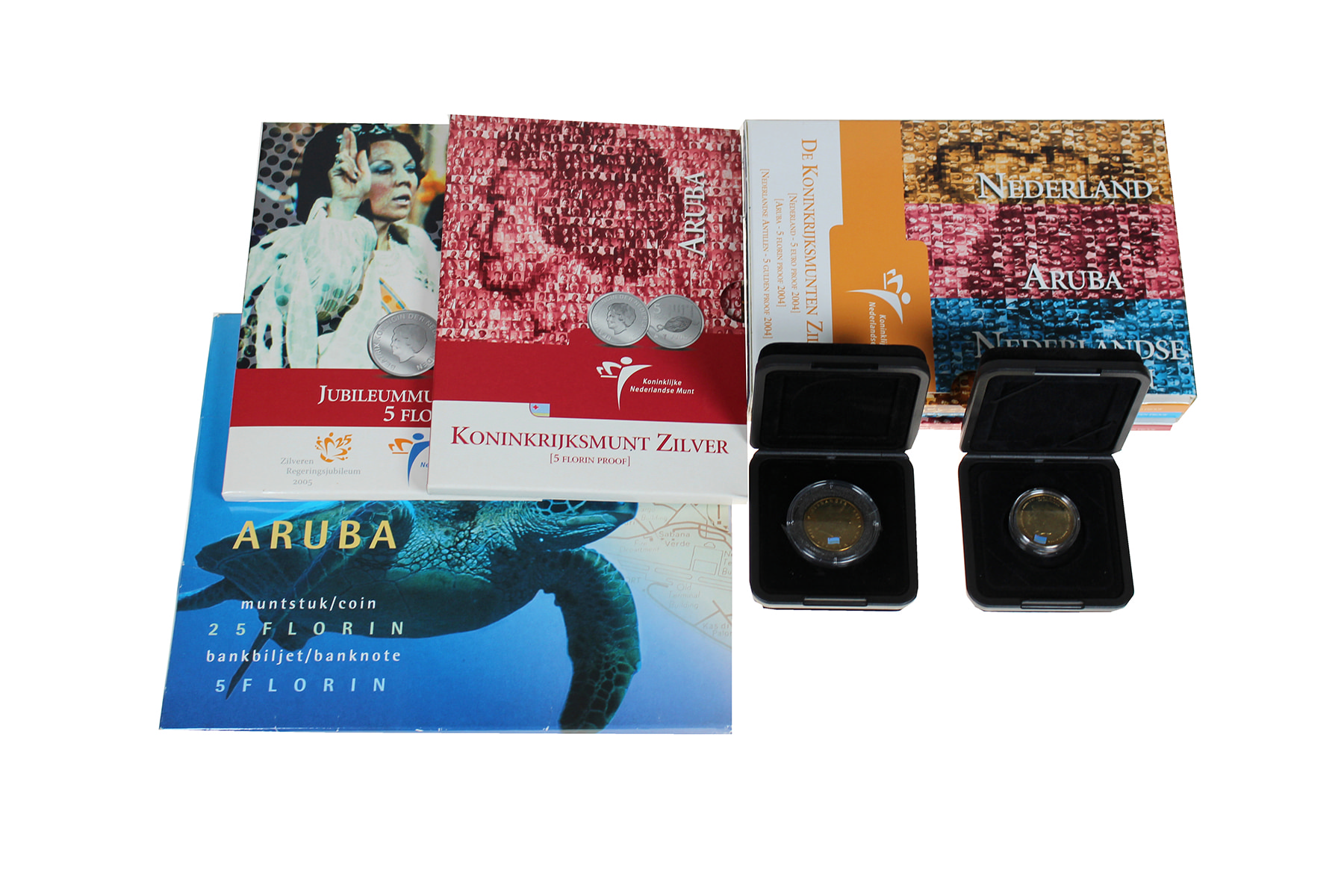 Doos met diverse Aruba, voornamelijk herdenkingsmunten, o.a. 5 florin proof.