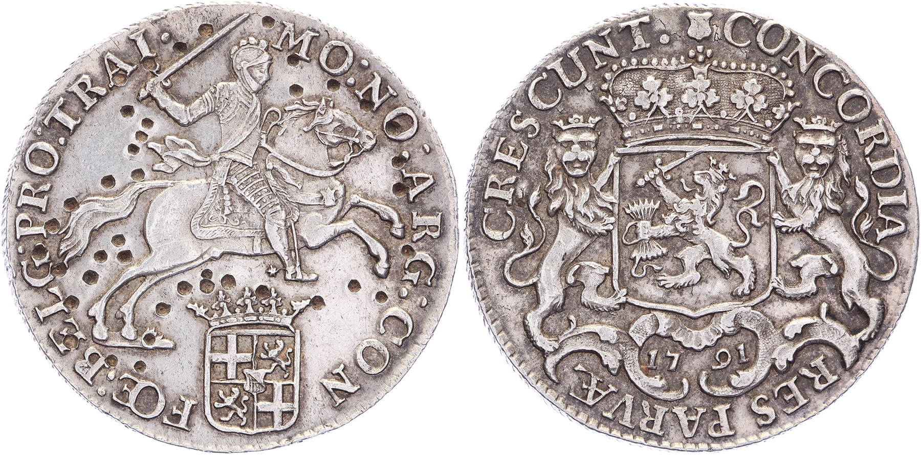 Halve zilveren rijder of halve dukaton 1791. Delm. 1055; CNM 2.43.106; HPM 60. Aan ruiterzijde zwaar geperforeerd, keerzijde oké. Zeer fraai.