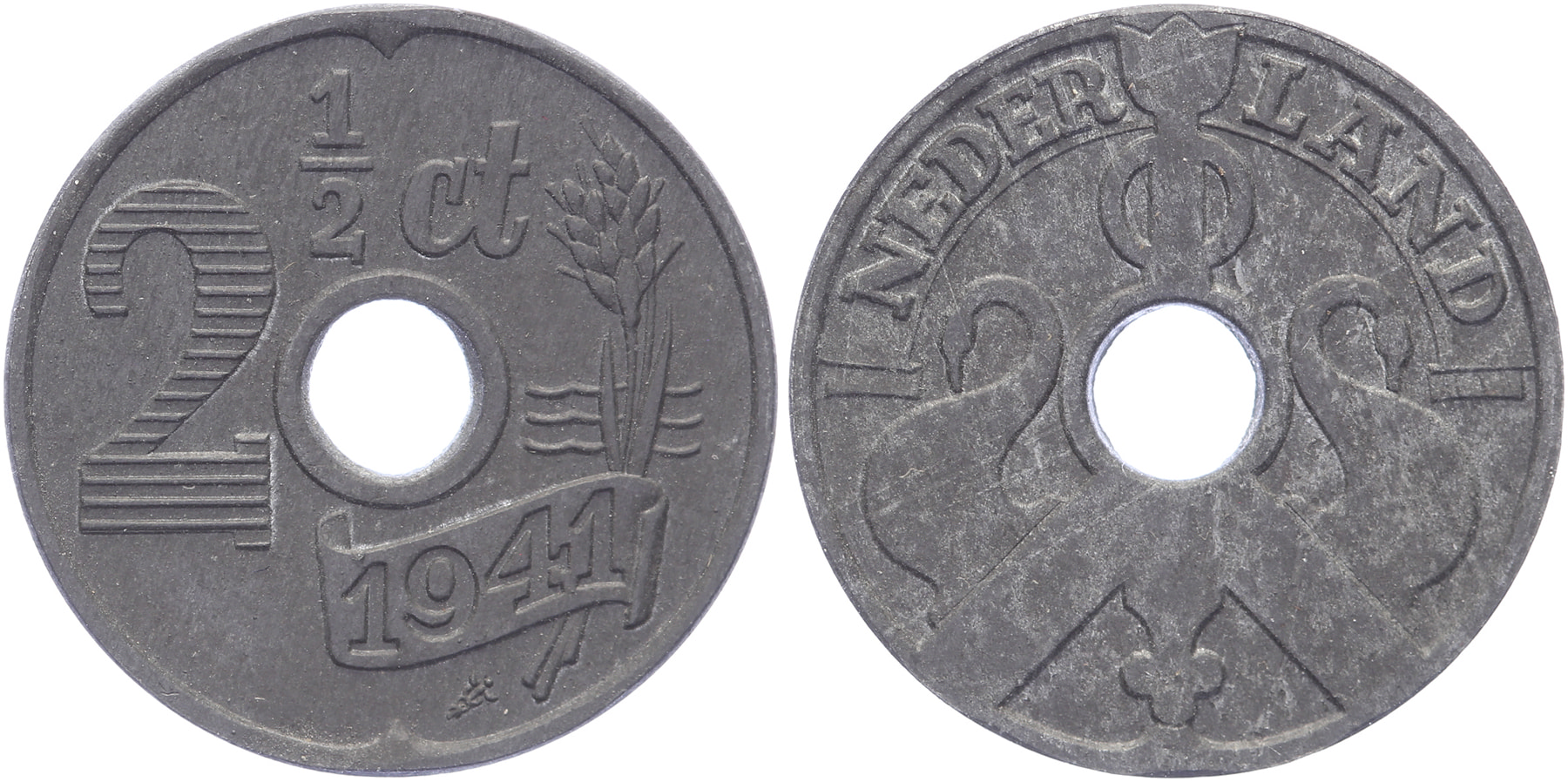 2 ½ Cent 1941 zink. Ontwerp LSch. 873; Sch. 1044. Zeldzaam.Centrale doorboring met 3 i.p.v. 4 golven. Prachtig / FDC