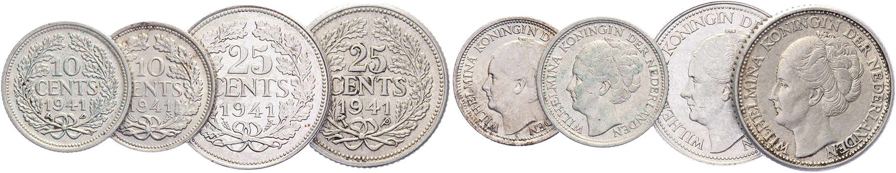 Lot (4) 10 Cents 1941 en 1941PP, 25 Cents 1941 en 1941PP LSch. 811, 817, 766, 770; Sch. 911, 1282, 875, 1280. Prachtig / FDC