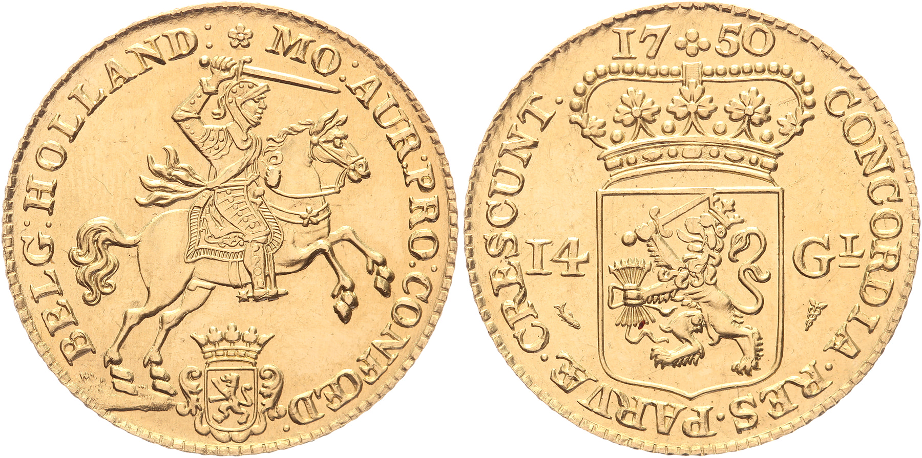 Rijder of 14 gulden 1750 mmt. vis. Destijds op verzoek van de Hollandsche Bank-Unie vervaardigd. Naslag uit de collectie van muntmeester J.W.A. van Hengel. 10 gram, 900/1000. FDC.