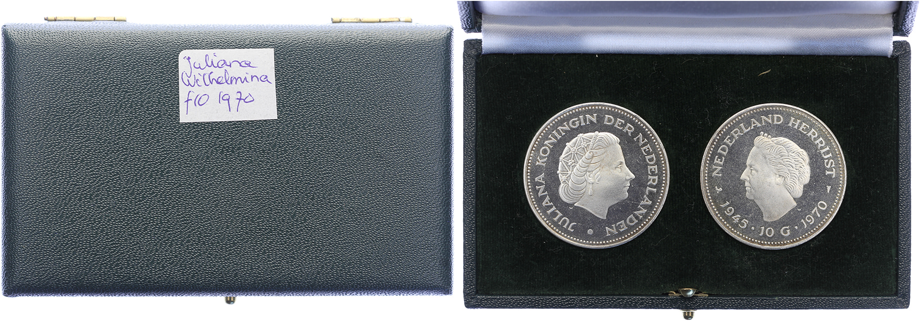 Lot (2) 10 Gulden 1970 mmt. haanBevrijdingstientje 1945-1970 LSch. 951; Sch. 1090. Voor- en keerzijde in originele cassette van ’s Rijks Munt. Uitermate zeldzaam. Proof