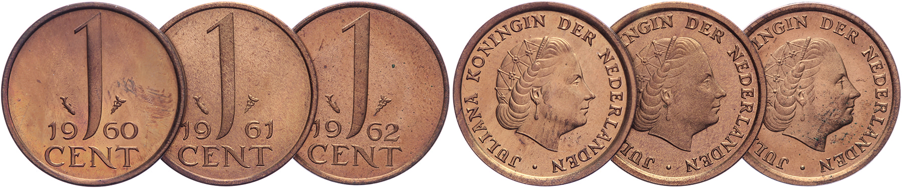 Lot (3) 1 Cent 1960, 1961 en 1962 mmt. vis LSch. 1099-1101; Sch. 1245-1247 Proof