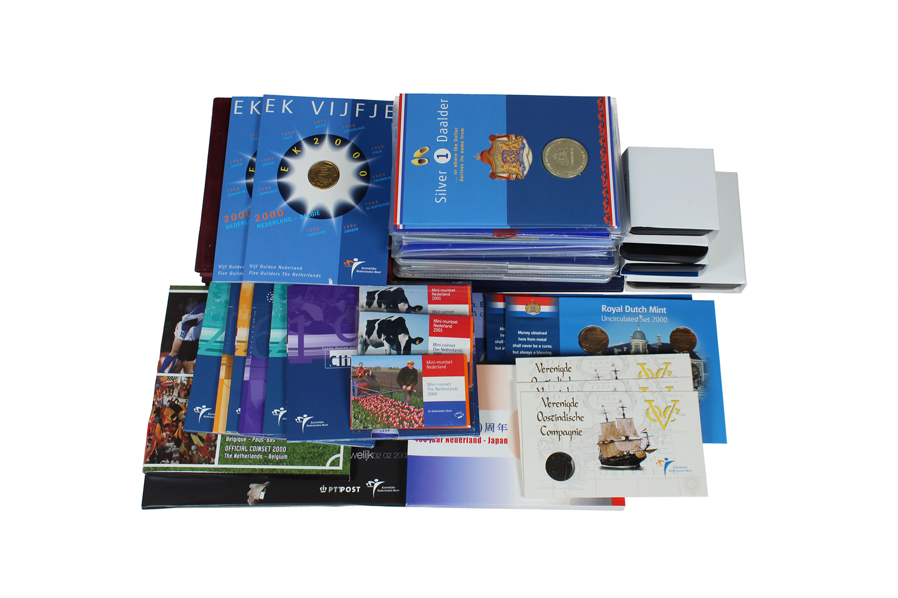 Doos met o.a. proof- en FDC-sets Nederland. O.a. 7 x proofsets en 15 x FDC-sets periode 1982-2001. Alsmede goede doelensets en themasets etc.