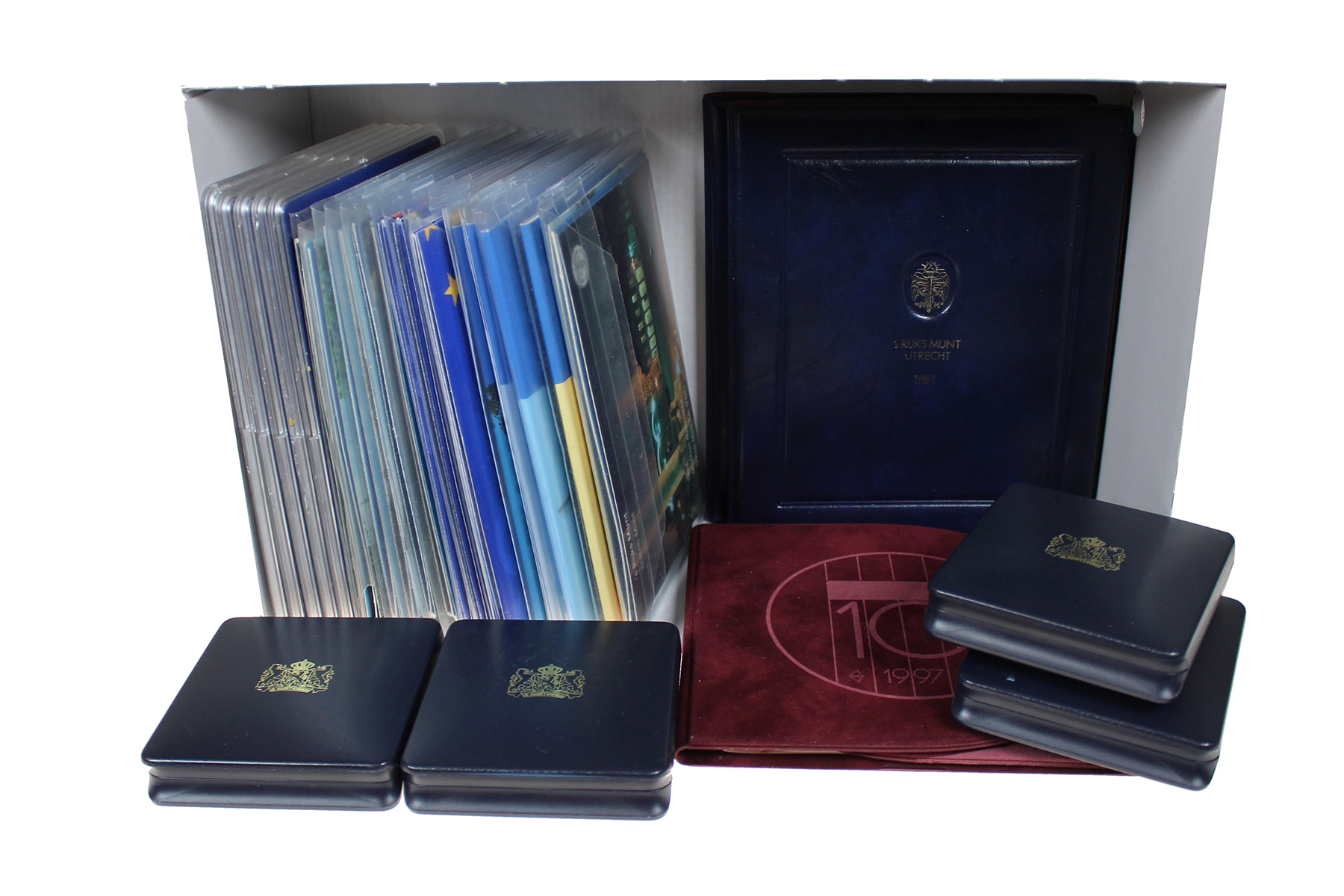 Doos met complete serie FDC-sets 1982-2002. Toegevoegd Proofset 1982, 1983 en 1997, alsmede 4 x inhuldigingsset 1980.