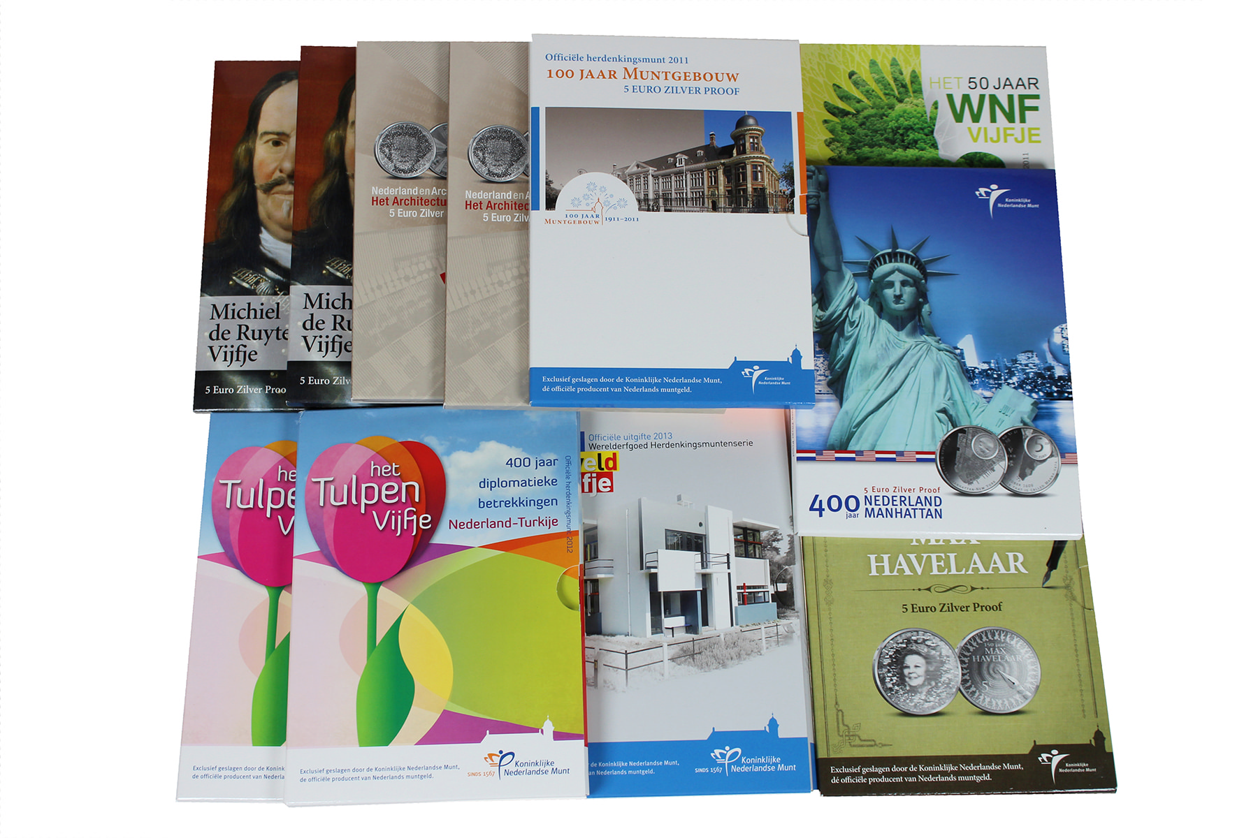 Blauwe cassette met 11 stuks 5 euro proof Nederland zilver.