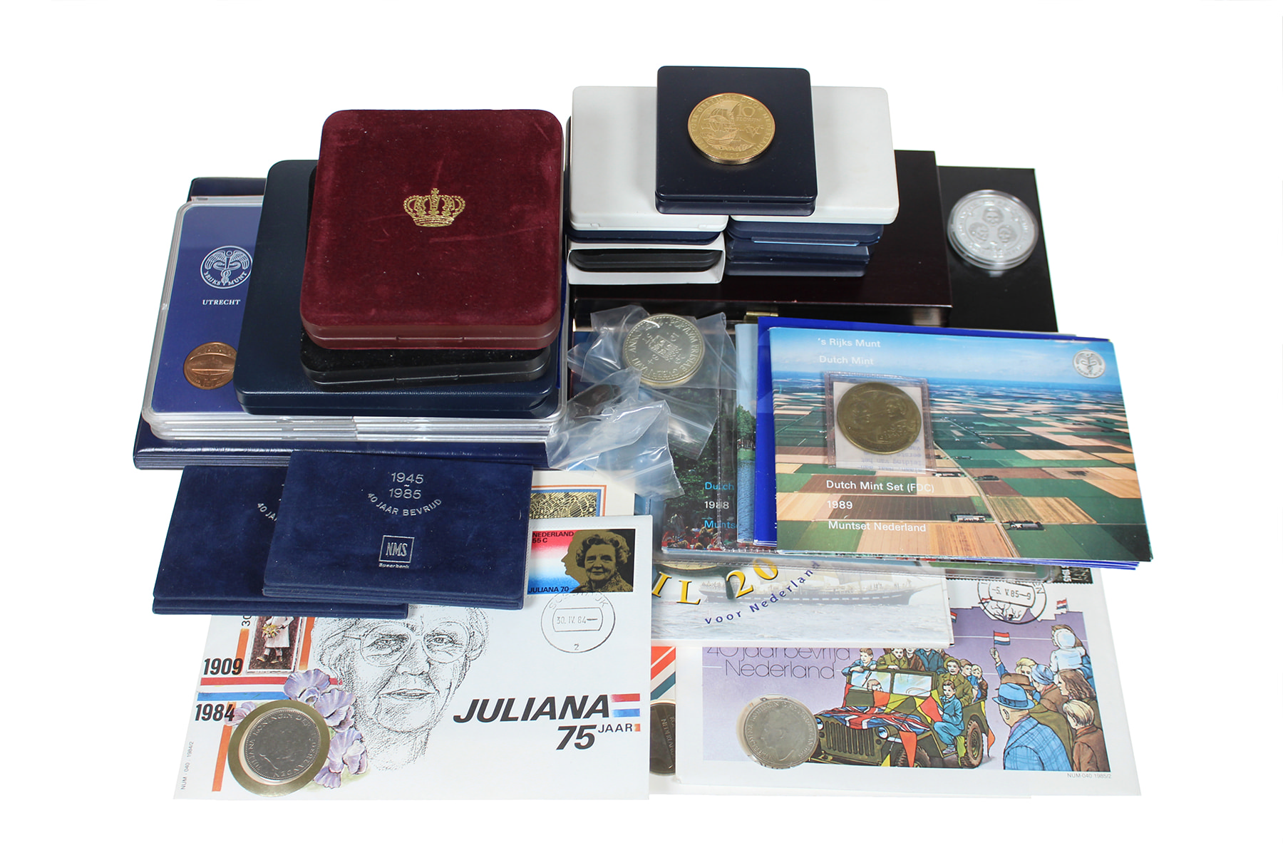 Schoenendoos vol jaarsets, muntsets, penningen en zilver. Oud en nieuw door elkaar. Zeer divers geheel!