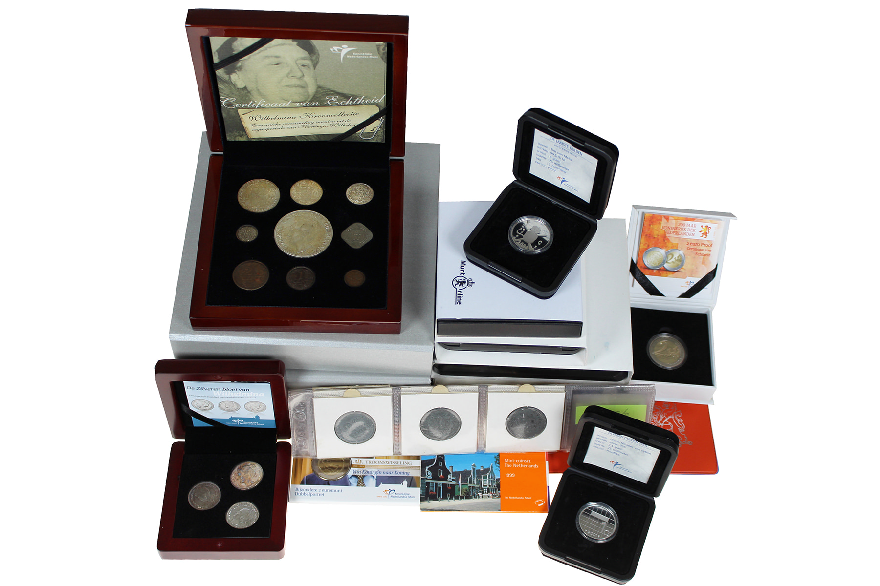 Doos met deels samengestelde sets van allerlei koninkrijksmunten van guldens naar euro’s.